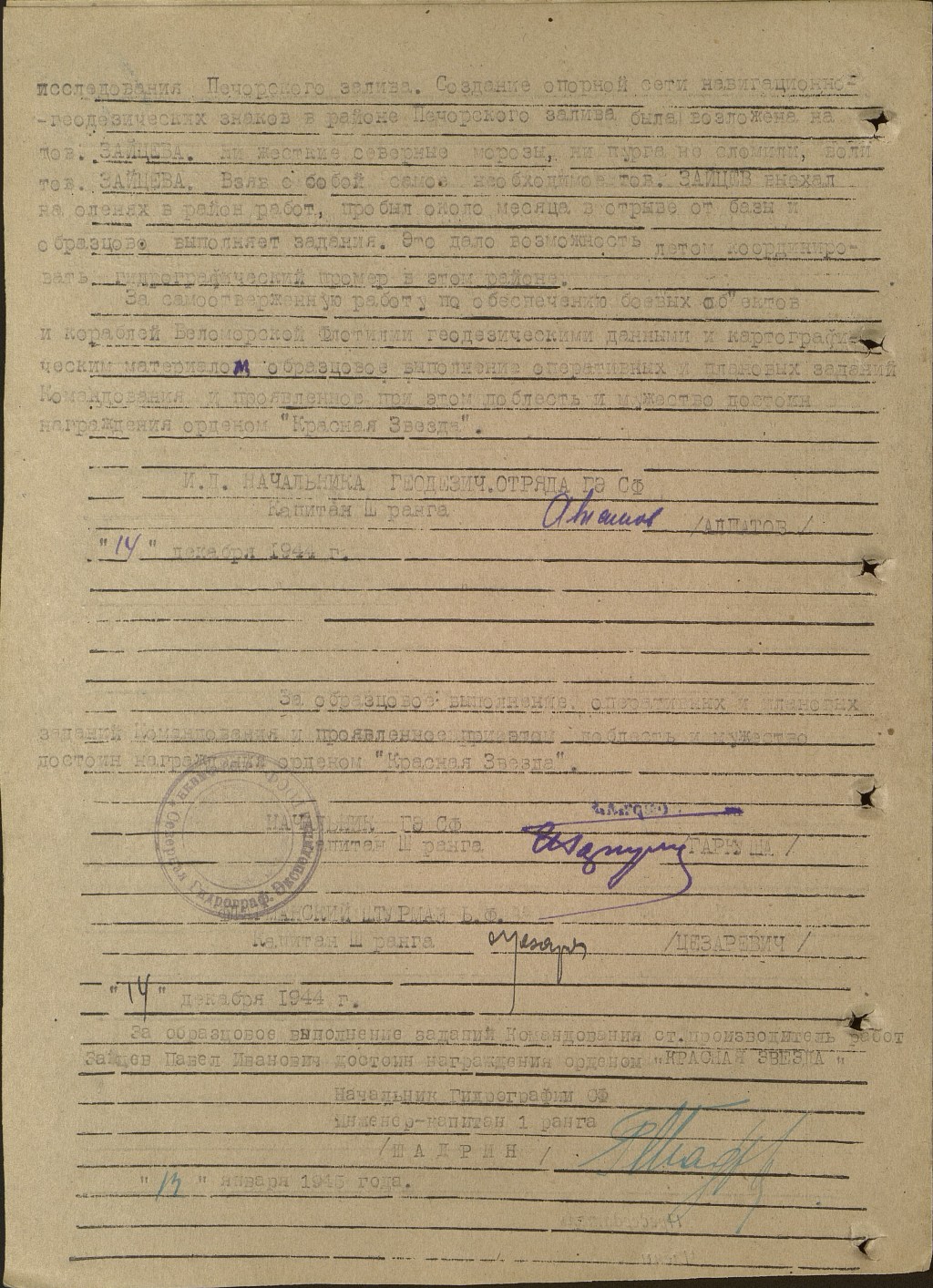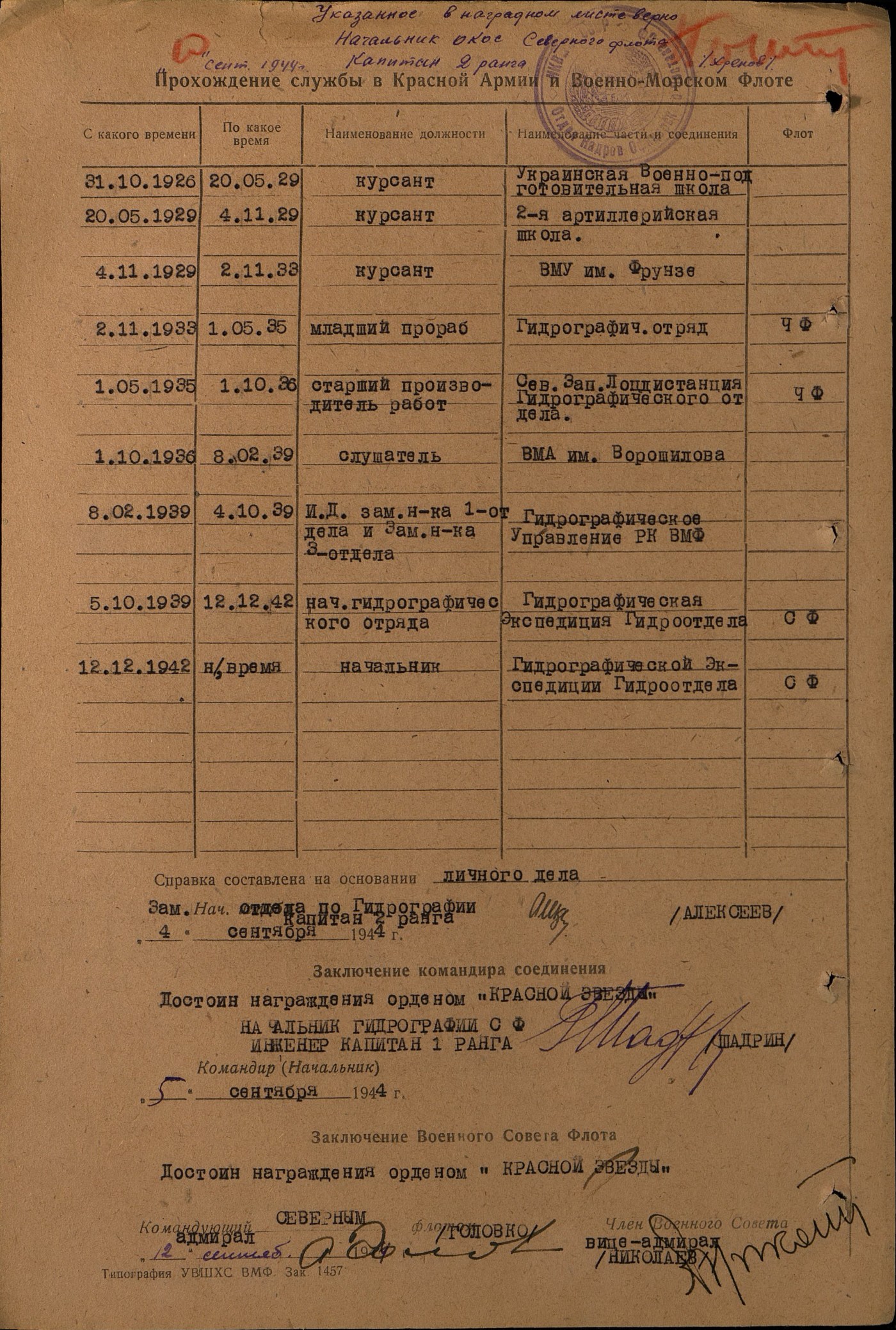 1. 1942 и 1943 г.г. по заданию Штаба С.Ф. производил топографическую съемку района Иоканкской военно-морской базы. Работал на пересеченной горной местности, будучи недостаточно обеспечен в материальном отношении по 10-16 часов в сутки.