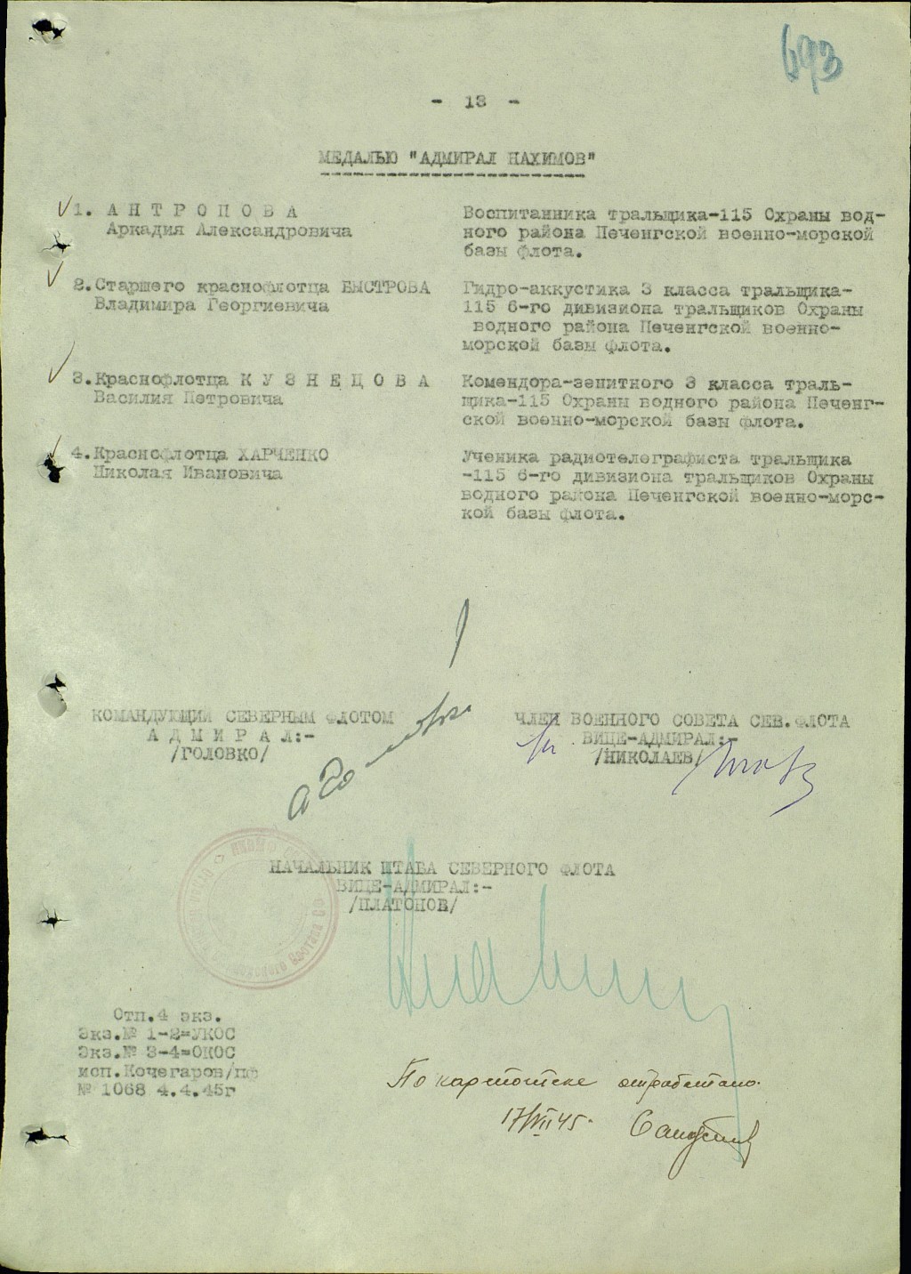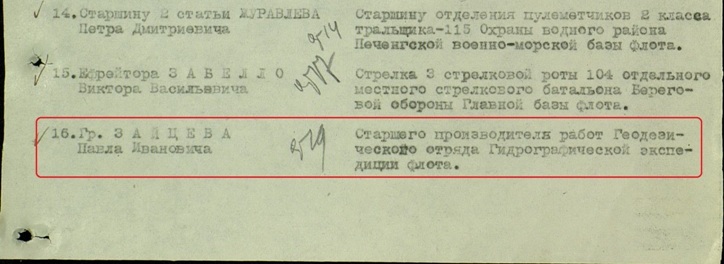 За самоотверженную работу по гидрографическому обеспечению боевых объектов и кораблей Б.Ф. и С.Ф., образцовое выполнение оперативных и плановых заданий и проявленные при этом доблесть и мужество достоин награждения медалью "ЗА БОЕВЫЕ ЗАСЛУГИ".