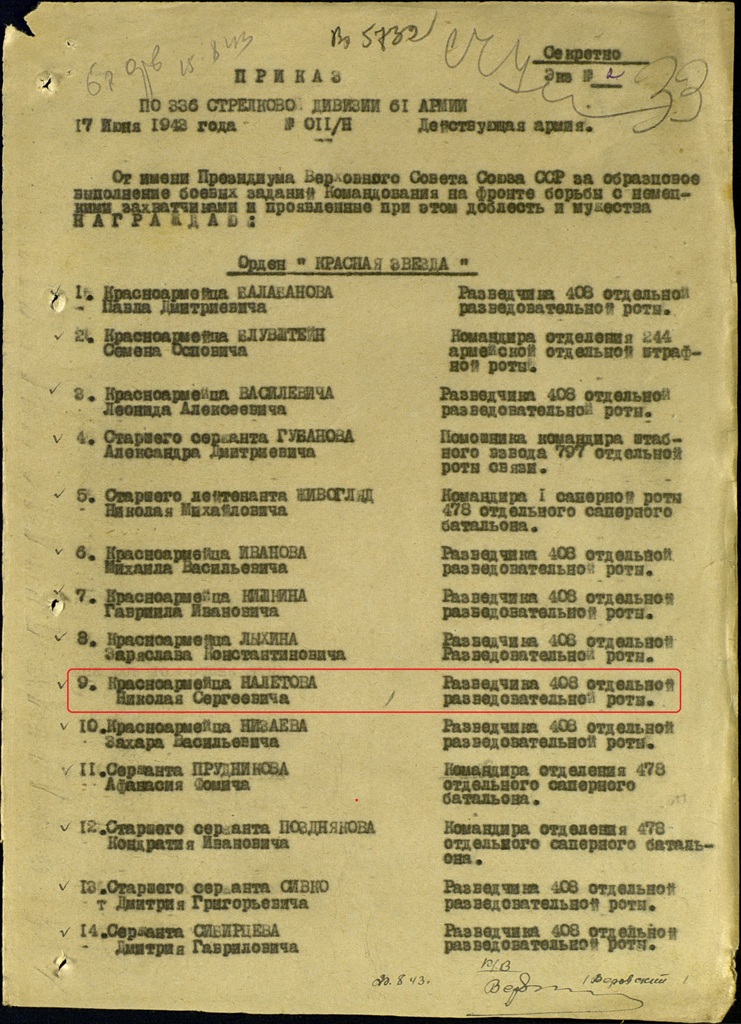 За период наступательных боев с 15 марта 1945 г. т. Налетов беспрерывно обеспечивал выбот наблюдательного пункта и вел наблюдение за движением и передним краем немцев. Особенно отличился т. Налетов 17 апреля 1945 г. Он получил задачу разведать высоту 304 и установить на ней наблюдательный пункт. Подойдя к высоте с четырьмя, приданными в его распоряжение, саперами, т. Налетов установил что на высоте находится боевое охранение противника. Т. Налетов, под прикрытием саперов, подполз к немецким пулеметчикам и гранатами забросал окоп в котором они находились. Три гитлеровца были убиты. Т. Налетов вскочил в окоп и огнем из пулемета прикрывал подход саперов. Немцы, пытаясь вернуть высоту, предприняли контратаку, но под командованием т. Налетова четыре сапера удержали высоту до подхода нашей пехоты. Достоин Правительственной награды орденом Отечественной войны II степени. Командир 408 отд.развед.роты Капитан [подпись] /Солнцев/ Достоин Правительственной награды орденом Отечественной войны II степени. Начальник разведотдела 336 стр. Житомир. ордена Суворова II ст. дивизии Капитан [подпись] /Пахомов/ "_" мая 1945 г.