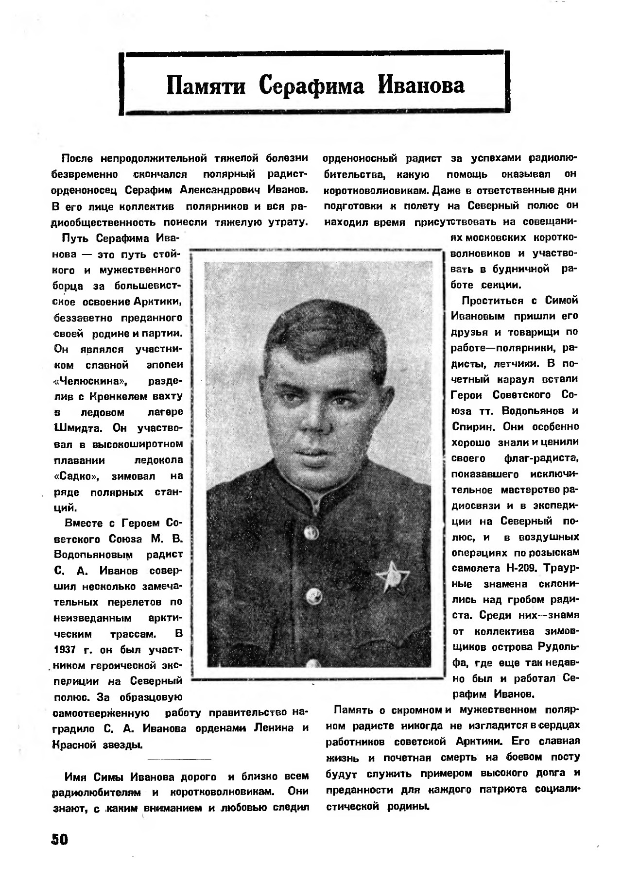 Имя Симы Иванова дорого и близко всем радиолюбителям и коротковолновикам. Они знают, с каким вниманием и любовью следил орденоносный радист за успехами радиолюбительства, какую помощь оказывал он коротковолновикам. Даже в ответственные дни подготовки к полету на Северный полюс он находил время присутствовать на совещаниях московских коротковолновиков и участвовать в будничной работе секции.