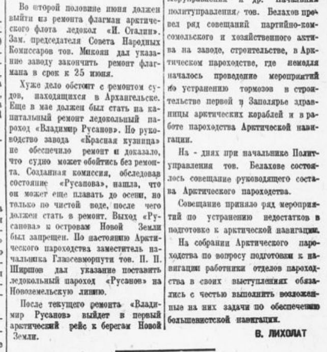 Хуже дело обстоит с ремонтом судов, находящихся в Архангельске. Еще в мае должен был стать на капитальный ремонт ледокольный пароход «Владимир Русанов». Но руководство завода «Красная кузница» не обеспечило ремонт и доказало, что судно может обойтись без ремонта. Созданная комиссия, обследовав состояние «Русанова», нашла, что он может еще плавать до осени, но только по чистой воде, после чего должен стать в ремонт. Выход «Русанова» к островам Новой Земли был запрещен. По настоянию Арктического пароходства заместитель начальника Главсевморпути тов. П. П. Ширшов дал указание поставить ледокольный пароход «Русанов» на Новоземельскую линию.