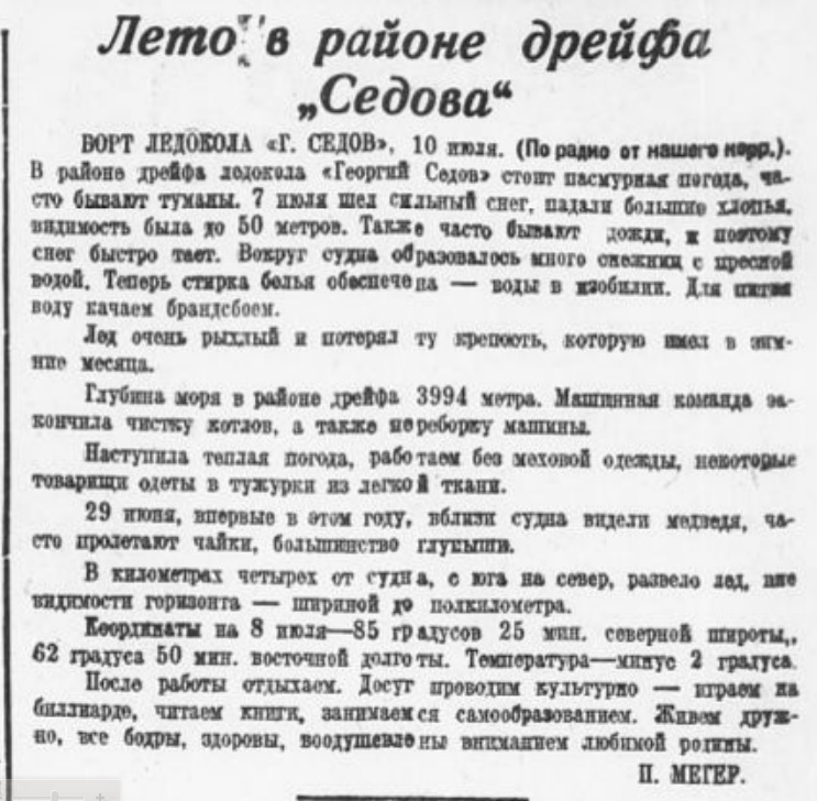 С наступлением полярного дня седовцы физически выглядят еще более крепкими и здоровыми, чем зимой. Моральное состояние очень высокое. Неисчерпаемая энергия не покидает пятнадцать смелых советских патриотов.