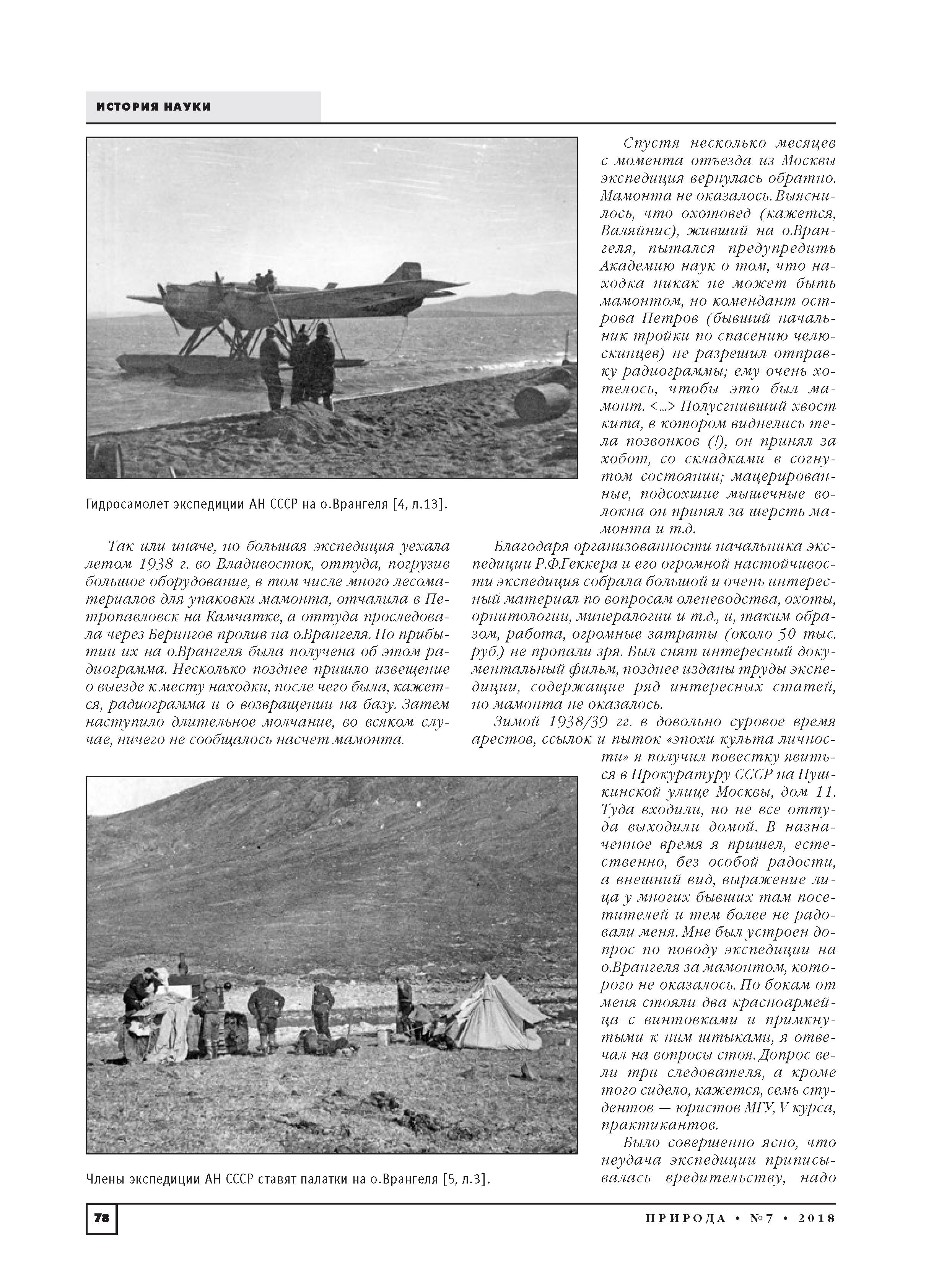 Летом 1937 года я был вместе с Я.М. Эглоном в Закавказье, где мы осматривали некоторые местонахождения ископаемых млекопитающих. В Цители-Цхаро (?Цители-Цхали), бывш. Красный колодец, была поставлена небольшая пробная раскопка на местонахождении гиппарионовой фауны. Однажды Эглон показал мне номер газеты, где сообщалось о находке на острове Врангеля мамонта, в замороженном состоянии, целый мамонт. «Ну, – подумал я – опять начинается, знаем мы этих мамонтов». Мне вспомнились уже бывшие ранее «находки» туш мамонта, когда либо были неполный череп и разрозненные кости, либо, в начале тридцатых годов, оказались остатки вмерзшего в лед кита. Одного такого мамонта в начале моей работы в Палеонтологическом (тогда Палеозоологическом) институте в Ленинграде я уговорил А.А. Борисяка сплавить Зоологическому институту Академии наук, так как в нашем институте мы не в силах изучать ничего кроме скелета, а мускулатура, внутренности и т.д. – объекты не палеонтологического характера. Зоологи тогда снарядили экспедицию, которую было поручено возглавить одному археологу и любителю севера, экспедиция поехала, Зоологический институт ухлопал изрядную сумму, по тем временам очень большую (?35 тысяч рублей), никакого мамонта не оказалось, археолог собрал кремешки и черепки, а Зоологический институт получил расходы.