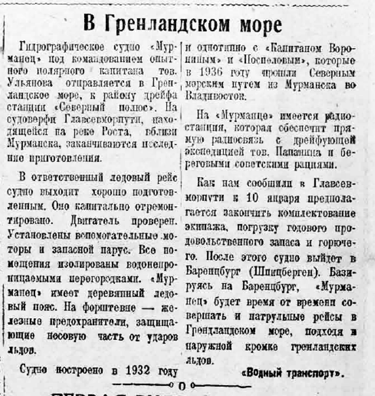 Сторожевое судно "Мурманец" выходит из Мурманска в Гренландское море к дрейфующей станции "Северный полюс". Газета "Правда" 13 января 1938 г