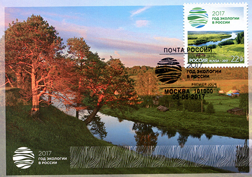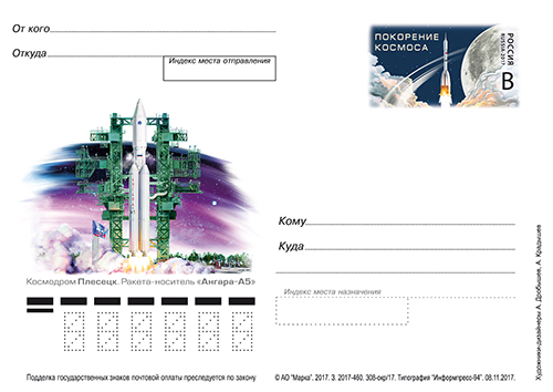 На почтовой карточке с оригинальной маркой помещён символический образ ракеты-носителя, запускаемой в космическое пространство; на основном изображении — запуск ракеты-носителя «Ангара-А5» с космодрома Плесецк.