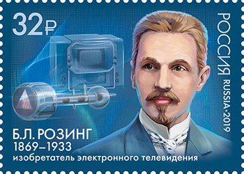 На почтовой марке изображён портрет Б.Л. Розинга на фоне модели приёмной электронно-лучевой трубки и телевизионного приёмника «КВН-49».