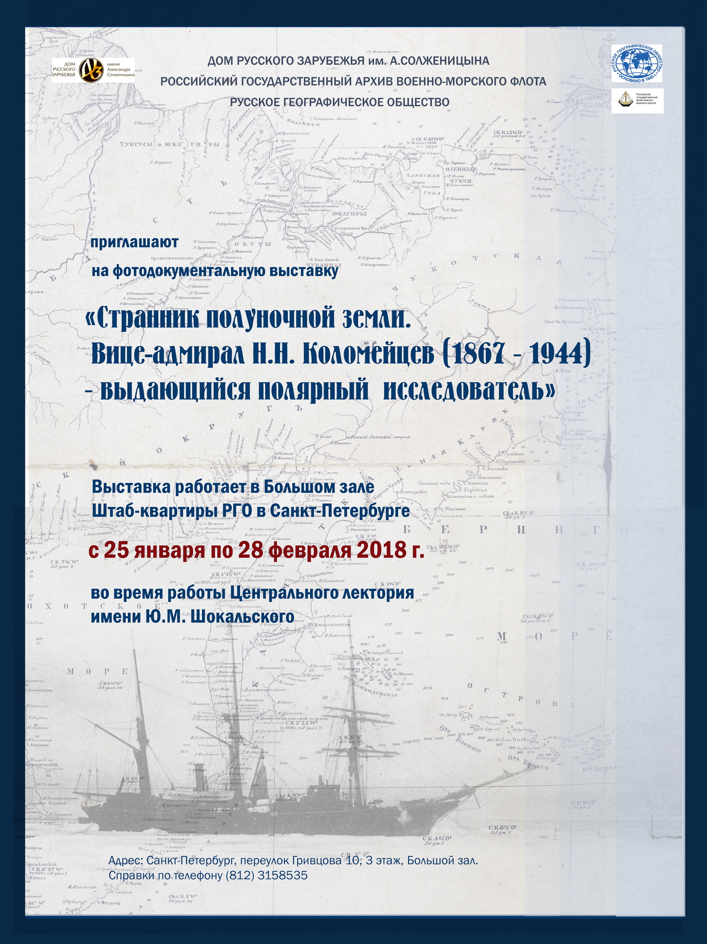 25 января в 18:30 в Большом зале Штаб-квартиры Русского географического общества в Санкт-Петербурге в рамках Лектория состоится открытие передвижной фотодокументальной выставки «Странник полуночной земли», посвященной вице-адмиралу Н.Н. Коломейцеву (1867-1944) – выдающемуся полярному исследователю.