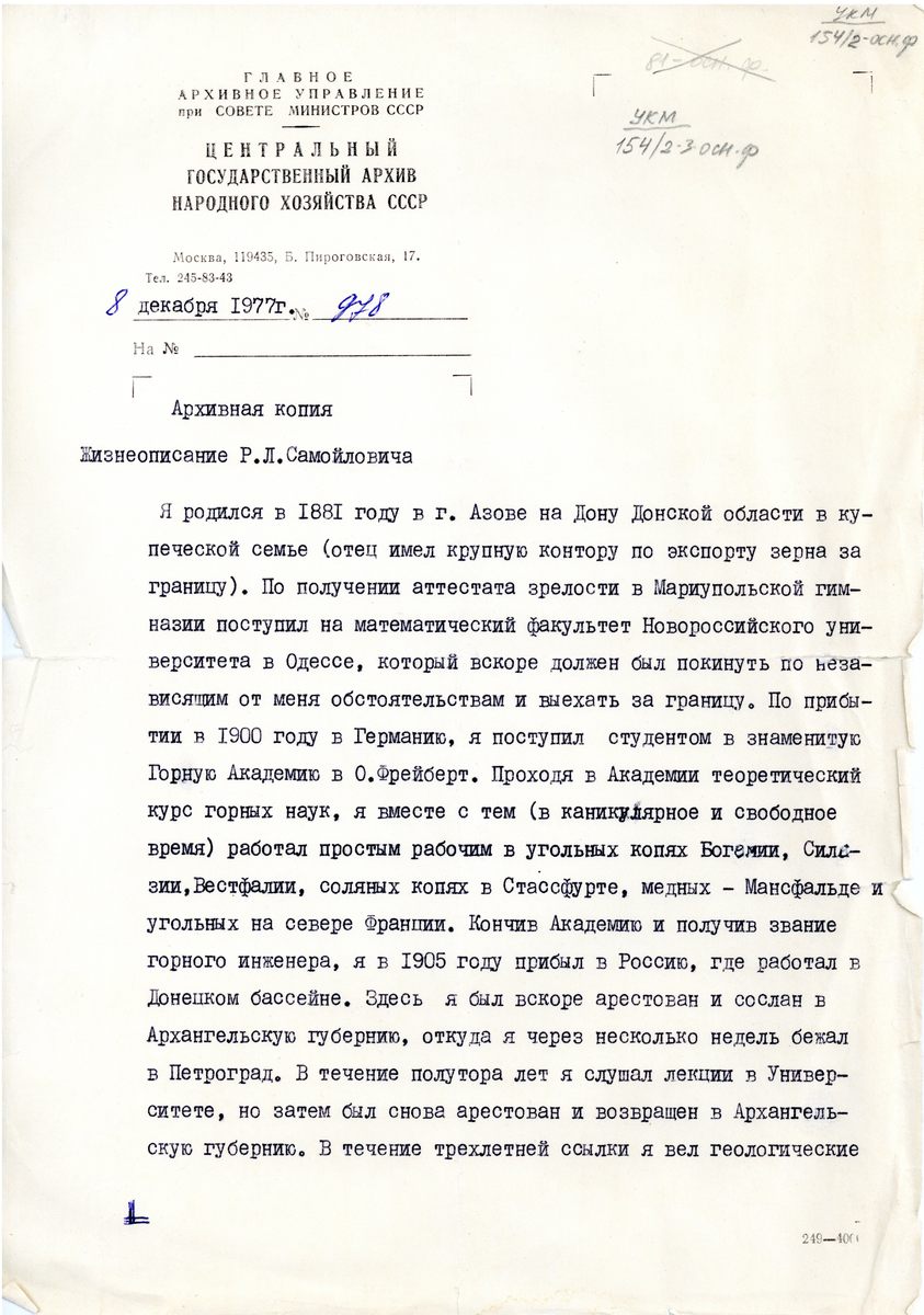 Справка "Жизнеописание Самойловича Рудольфа Лазаревича".Копия архивная №978.