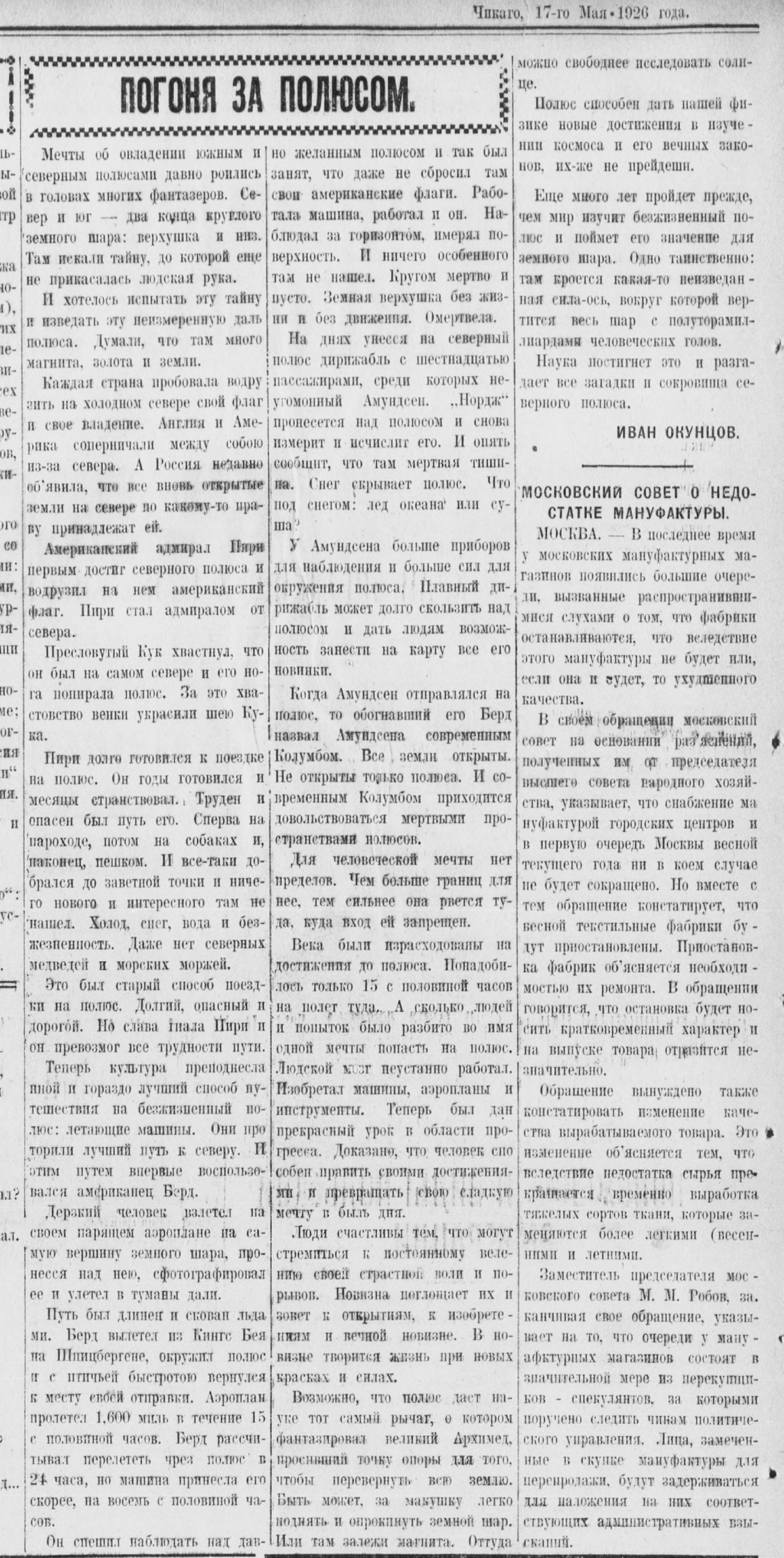 Окунцов И.Погоня за полюсом //Русский вестник 17 мая 1926