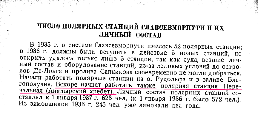 Строительство станции Перевальной, начатое 16 декабря 1936 г., происходило при особенно тяжелых условиях. Попытки перебросить оборудование через Анадырский хребет на вездеходе вначале не увенчались успехом. Пришлось прибегнуть к помощи самолетов. Под руководством начальника авиаотряда т. Каминского и начальника станции Перевальная т. Ардамацкого 16, 17 и 19 декабря было сделано 3 рейса на машинах „Р5-Н44" и „Н-67" (по 2 самолета в каждый рейс) и 24 декабря - один рейс на 2 самолетах „Р5-Н42", „ДН44-Н67" и переброшено при этом все необходимое для начала работ на станции: около 3 т груза и 3 пассажира. На эти полеты затрачено самолетами 20 час. 40 мин. пребывания в воздухе; полеты происходили при -38 -40°. На станции Перевальной оставлены начальник Ардамацкий, радист Хомутов и строитель Галкин. Установлена радиосвязь с заливом Кресты. Благодаря наблюдениям с самолета удалось найти удобный переход через перевал Анадырского хребта для вездеходов, через который и перебрасываются ныне дальнейшие грузы.