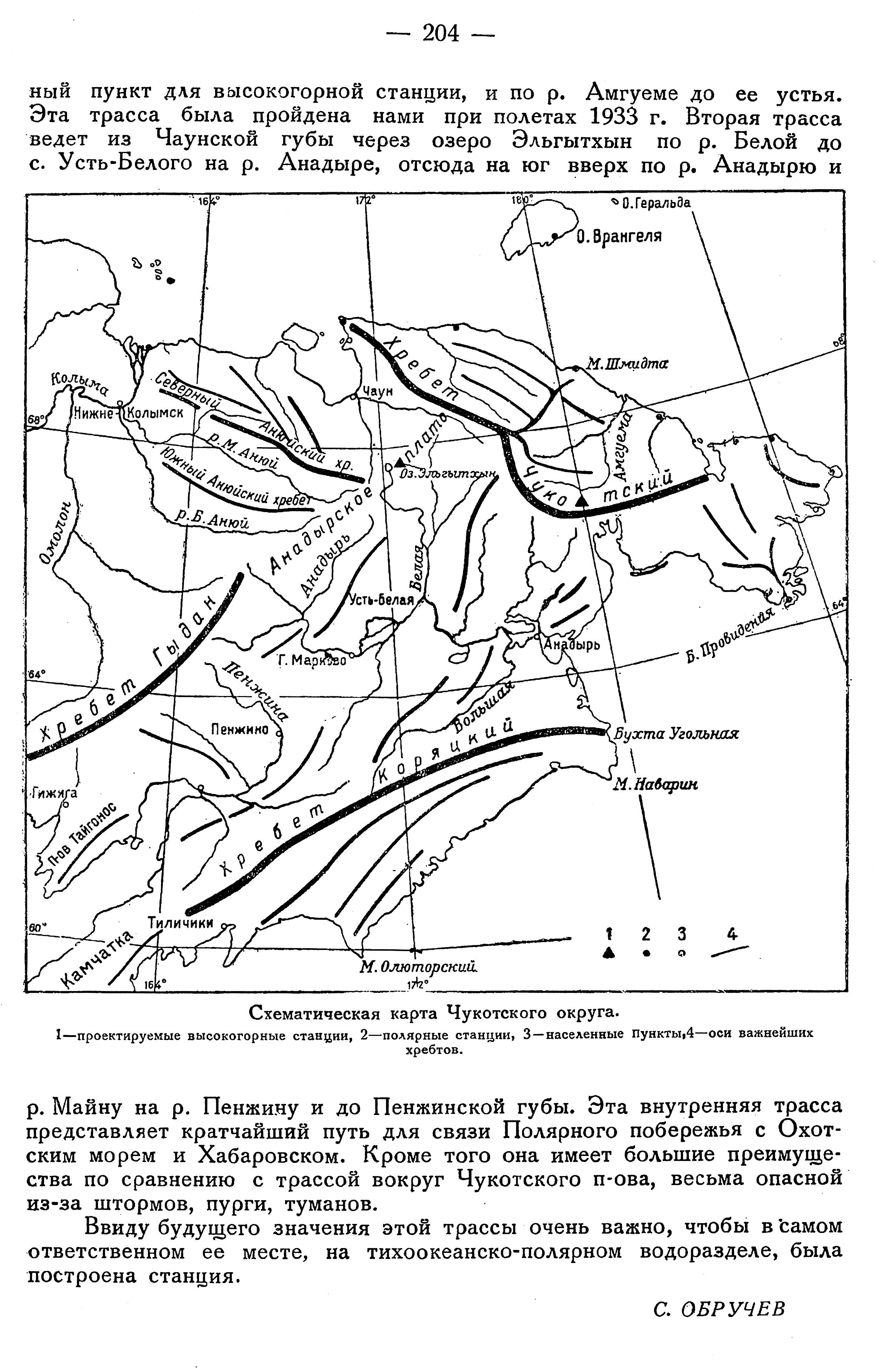 Наконец, станция явится авиабазой на важнейшей воздушной трассе. Какая уже писал, два воздушных пути соединяют южную часть Чукотского округа с полярным его побережьем. Первый путь ведет из сел. Анадырь по долине р. Татли-ваам через перевал, где мною намечается восточный пункт для высокогорной станции, и по р. Амгуеме до ее устья. Эта трасса была пройдена нами при полетах 1933 г. Вторая трасса ведет из Чаунской губы через озеро Эльгытхын по р. Белой до с. Усть-Белого на р. Анадыре, отсюда на юг вверх по р. Анадырю и р. Майну на р. Пенжину и до Пенжинской губы. Эта внутренняя трасса представляет кратчайший путь для связи Полярного побережья с Охотским морем и Хабаровском. Кроме того она имеет большие преимущества по сравнению с трассой вокруг Чукотского п-ова, весьма опасной из-за штормов, пурги, туманов.