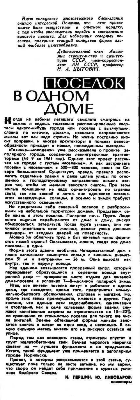 Итак, жители поселка живут и работают а одном дома, где находятся, кроме того, предприятия коммунально-бытового обслуживания, столовая и магазин. Но, кроме этих явных преимуществ, имеются и другие. Подсчитано, что единые сети водоснабжения, канализации и отопления, как и сама кольцевая форма здания, снижают капитальные затраты на строительство на 15-—20% по сравнению со стоимостью поселка для такого же числе жителей. Здание обтекаемой формы меньше заносится снегом и имеет не один вход, а несколько. В самую сильную метель жители его не рискуют остаться на улице.