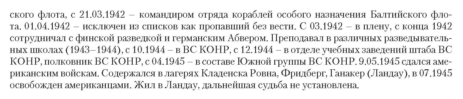 Несколько месяцев содержался в различных лагерях для военнопленных, с конца 1942 г. сотрудничал с финской военной разведкой и [432] абвером. В 1943–1944 гг. преподавал в различных разведывательных школах. С апреля 1945 г. в составе Вооруженных Сил Комитета Освобождения народов России, в мае того же года сдался представителям американской армии в р-не Каплице-Крумау. Выдал себя за старого эмигранта и освобожден американцами из лагеря Ганакере. Жил в Ландау. Полковник ВС КОНР.