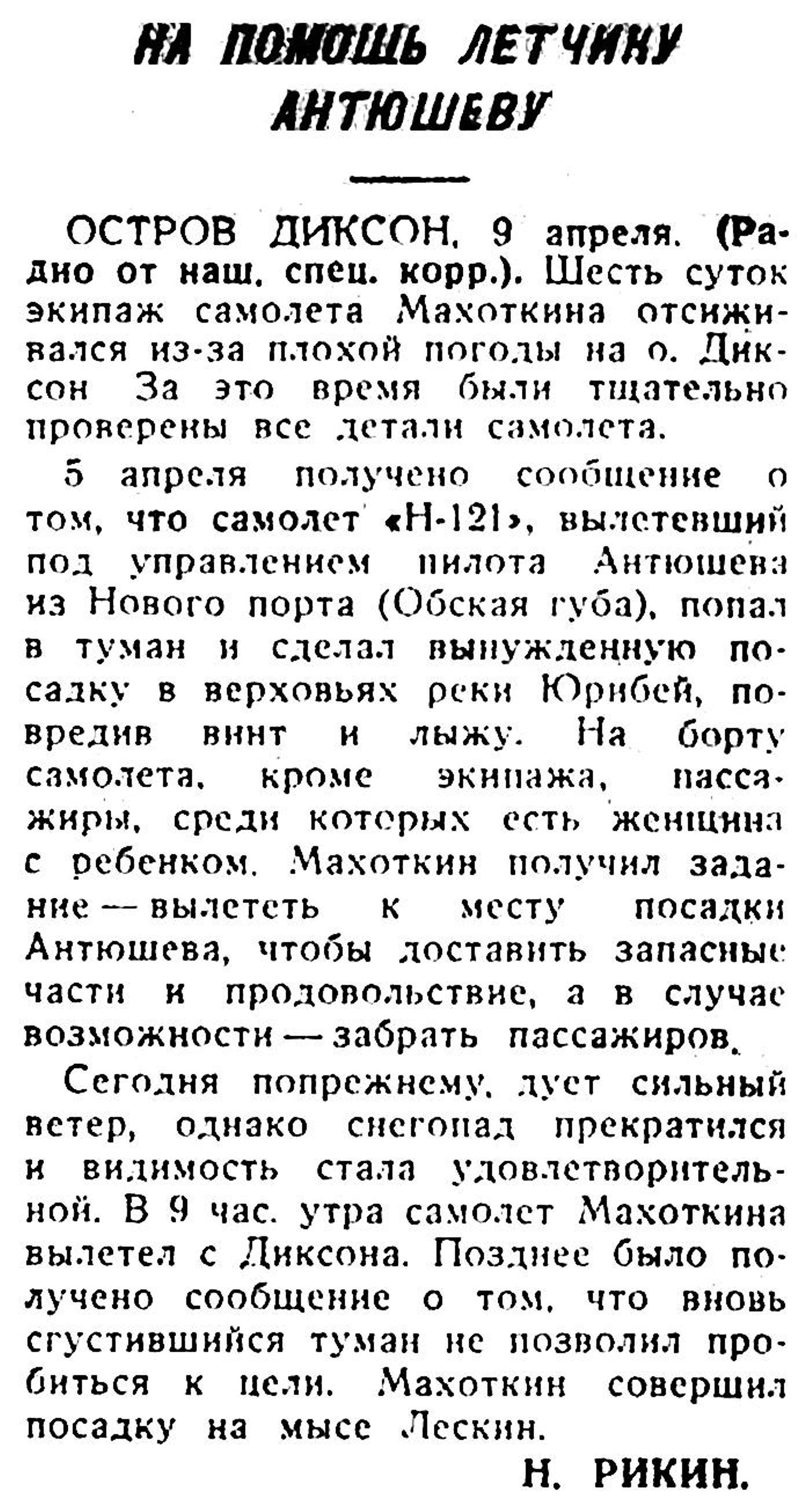 АНТЮШЕВУОСТРОВ ДИКСОН. 9 апреля. (Радио от наш. спец. корр.). Шесть суток экипаж самолета