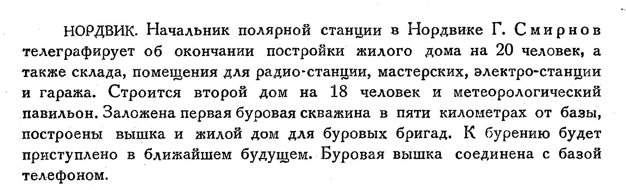 НОРДВИК. Начальник полярной станции в Нордвике Г. Смирнов телеграфирует об окончании постройки жилого дома на 20 человек, а также склада, помещения для радио-станции, мастерских, электро-станции и гаража. Строится второй дом на 18 человек и метеорологический павильон. Заложена первая буровая скважина в пяти километрах от базы, построены вышка и жилой дом для буровых бригад. К бурению будет приступлено в ближайшем будущем. Буровая вышка соединена с базой телефоном.