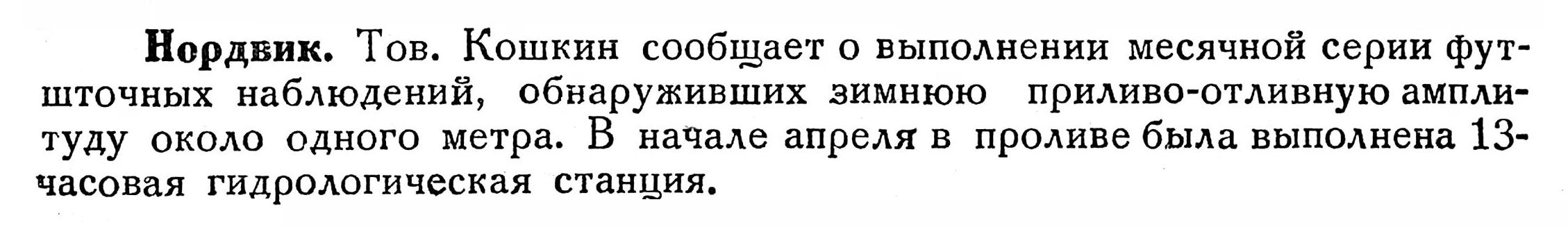 Нордвик. Тов. Кошкин сообщает о выполнении месячной серии футшточных наблюдений, обнаруживших зимнюю приливо-отливную амплитуду около одного метра. В начале апреля в проливе была выполнена 13-часовая гидрологическая станция.