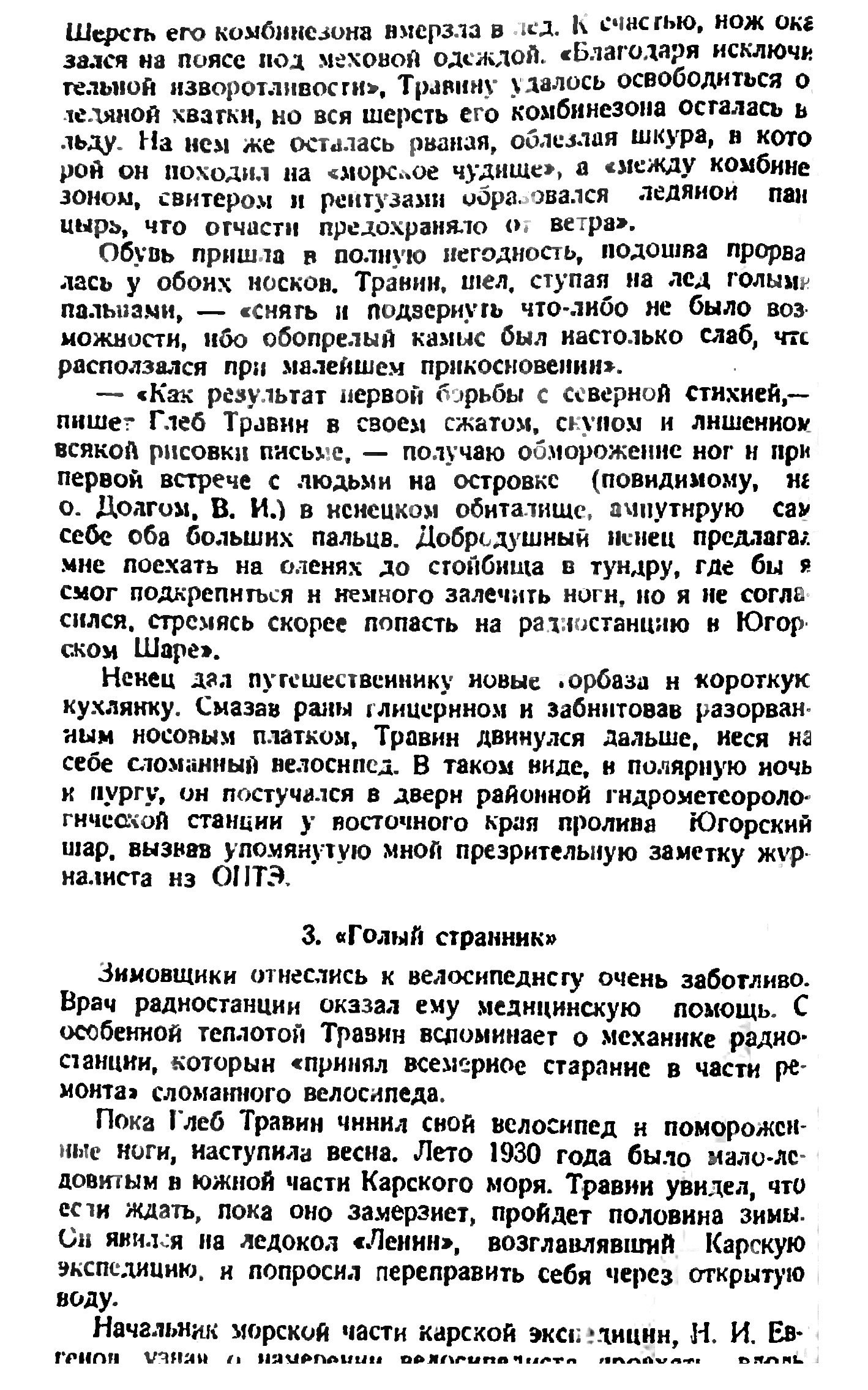 Зимней ночью, в пургу, — говорилось в радиограмме,— в дверь общежития радистов раздался сильный стук. Вошел человек в кожаной куртке, со сломанным велосипедом в руках. Он назвал себя кругосветным путешественником, Глебом Травиным. У него была зеленая повязка и удостоверение какого-то захолустного отделения ОПТЭ.