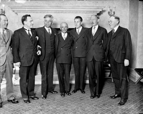 Д.В.Фуфаев (3-й справа) с членами экипажа "Страны Советов" на дипломатическом приёме в США. Слева от Ф.Е.Болотова (3-й слева) - американцы Чарльз С.Петерсон и полковник Ф.А.Сиквеланд).