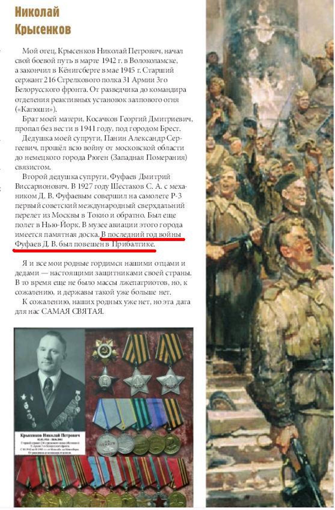 Мой отец, Крысенков Николай Петрович, начал свой боевой путь в марте 1942 г. в Волоколамске, а закончил в Кёнигсберге в мае 1945 г. Старший сержант 216 Стрелкового полка 31 Армии 3го Белорусского фронта. От разведчика до командира отделения реактивных установок залпового огня («Катюши»). Брат моей матери, Косачков Георгий Дмитриевич, пропал без вести в 1941 году, под городом Брест. Дедушка моей супруги, Панин Александр Сергеевич, прошёл всю войну от московской области до немецкого города Рюген (Западная Померания) связистом. Второй дедушка супруги, Фуфаев Дмитрий Виссарионович. В 1927 году Шестаков С. А. с механиком Д. В. Фуфаевым совершил на самолете Р-3 первый советский международный сверхдальний перелет из Москвы в Токио и обратно. Был еще полет в Нью-Йорк. В музее авиации этого города имеется памятная доска. В последний год войны Фуфаев Д. В. был повешен в Прибалтике. Я и все мои родные гордимся нашими отцами и дедами — настоящими защитниками своей страны. В то время еще не было массы лжепатриотов, но, к сожалению, и державы такой уже больше нет. К сожалению, наших родных уже нет, но эта дата для нас САМАЯ СВЯТАЯ.