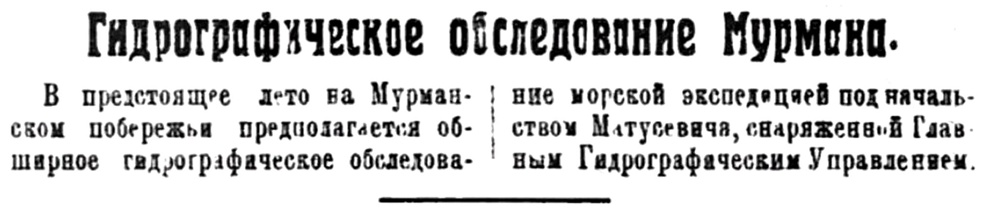 В предстоящее лето на Мурманском побережьи предполагается обширное гидрографическое обследование морской экспедицией под начальством Матусевича, снаряженной Главным Гидрографическим Управлением.