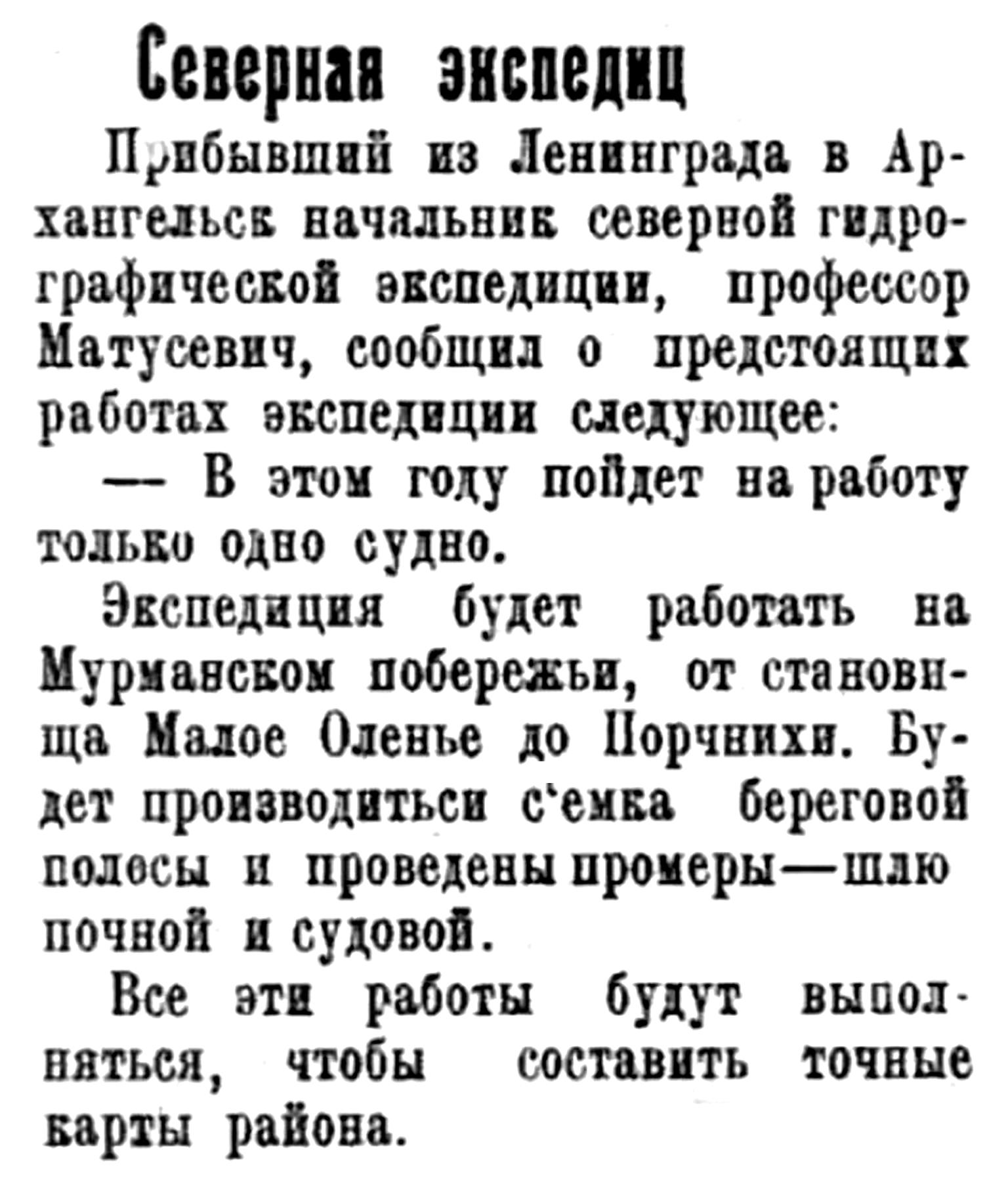 Прибывший из Ленинграда в Архангельск начальник северной гидрографической экспедиции, профессор Матусевич, сообщил о предстоящих работах экспедиции следующее: