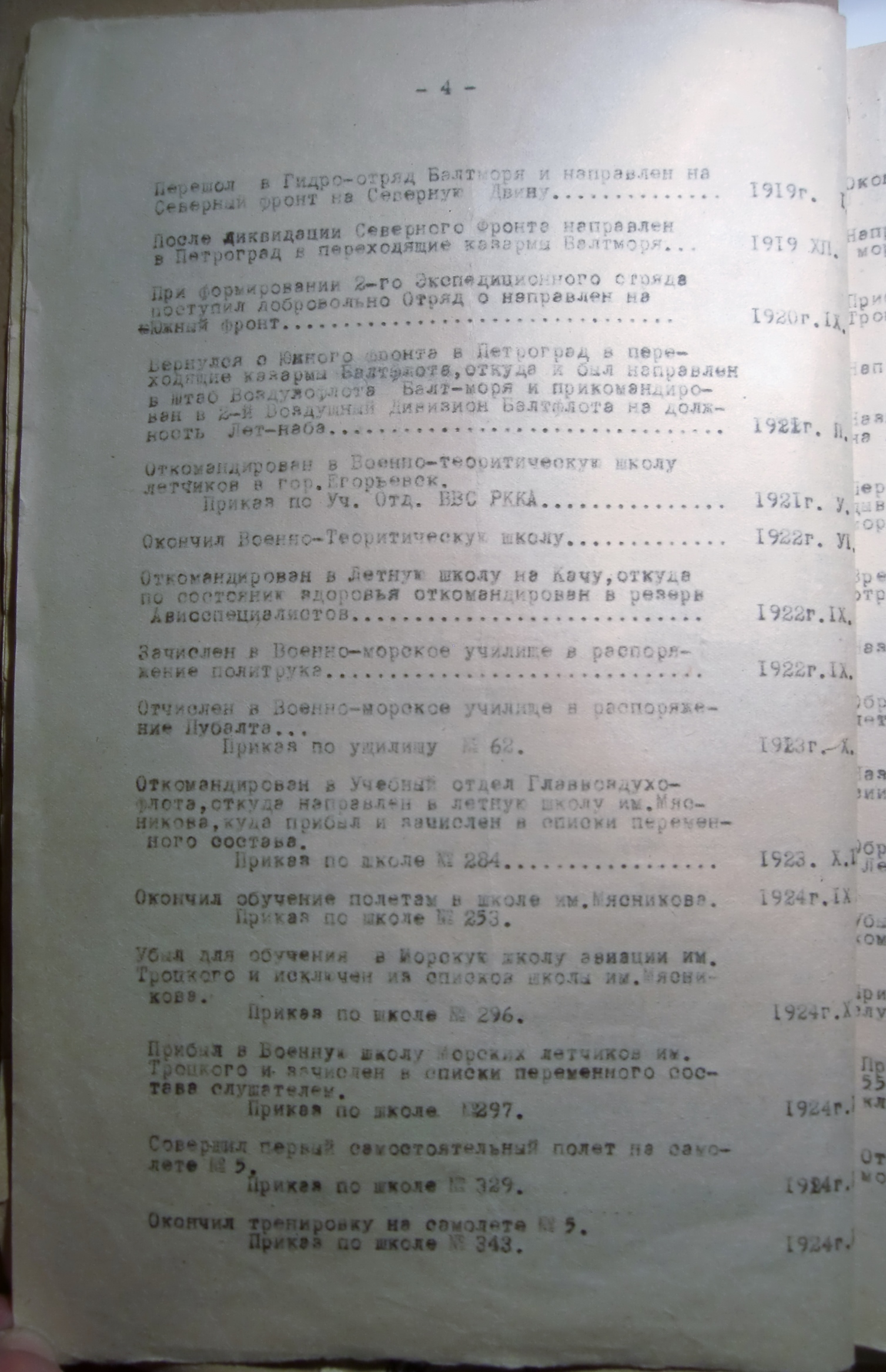 "С 1921 г. после ликвидации всех (?) офицеров начал учиться в Т.Ш.Летчиков гор. Егорьевск. Сухопутную школу летчиков окончил в 1923 г. "Кача".