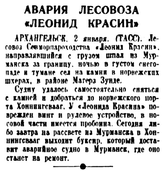 АРХАНГЕЛЬСК. 2 января. (ТАСС). Лесовоз Севморпароходства "Леонид Красин", направлявшийся с грузом шпал из Мурманска за границу, ночью в густом снегопаде и тумане сел на камни в норвежских шхерах, в районе Магера Зунде.