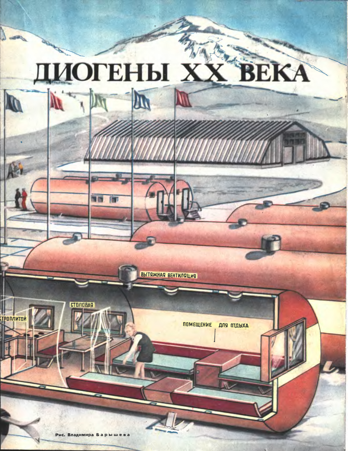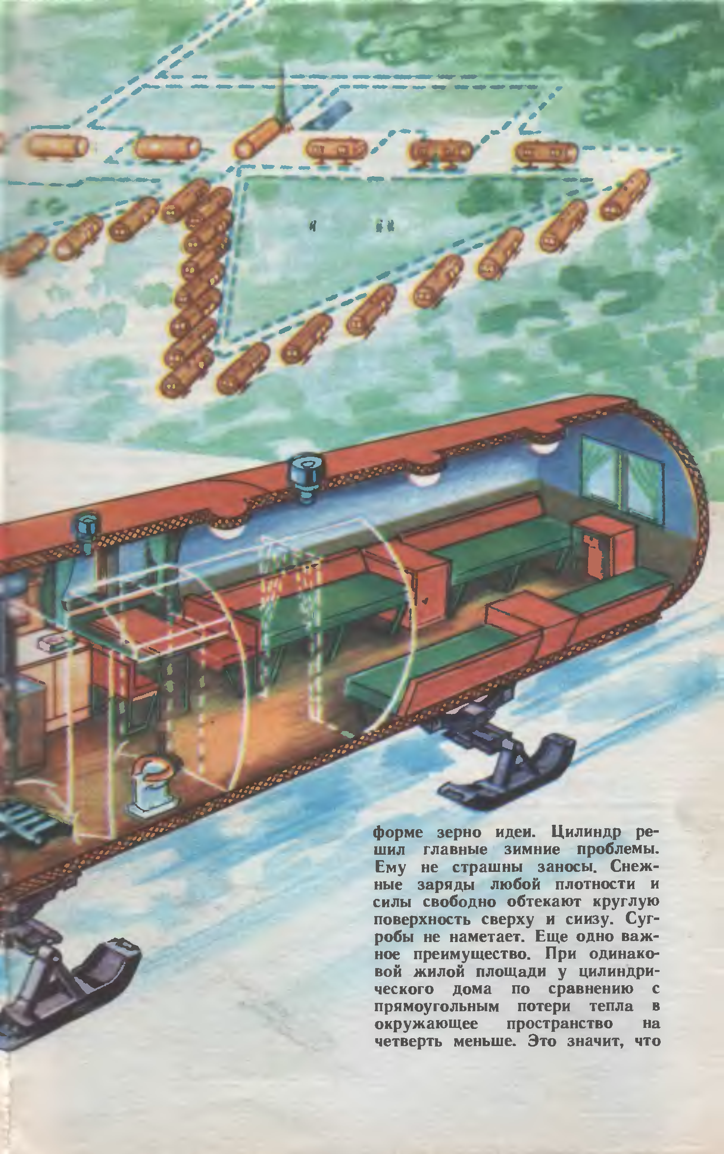 Не станем, однако, длить список рационализаторских предложений, внесенных рабочими и инженерами завода в рождение любимого (теперь уже можно так сказать) детища, ибо тогда нам придется «пройтись» чуть ли не по всей технологии изготовления «цубика», посмотрим на него в том законченном виде, каким приходит домик к своим хозяевам. Даже при беглом взгляде на эти снимки видно, что «цубик» вовсе не похож на дом в привычном нашем представлении. Вытянутый и поставленный горизонтально красно-серый цилиндр напоминает скорее железнодорожную цистерну на колесах (или лыжах – в зависимости от условий транспортировки). Но это не прихоть конструкторов, а зерно идеи, которая полностью решает проблему пурги и гарантирует домик от снежных заносов. Снежные заряды любой плотности и силы свободно обтекают металлический цилиндр, толстые тройные окна которого делают его похожим на глубоководный снаряд с иллюминаторами.