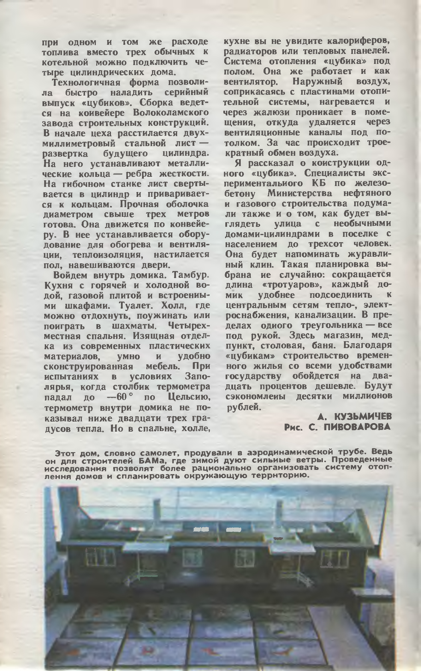 Пока еще не всякому привычно, может быть, вообразить себе его жителей – изыскателей, бурильщиков, сварщиков или одну молодую семью – в обстановке, прямо скажем, нам незнакомой, но тем не менее мы имеем дело со свершившимся фактом, который должен стать нормой условий человеческого жилья на Крайнем Севере. Вот почему со всей искренностью и доброжелательностью мы говорим: «Здравствуй, «цубик»!»