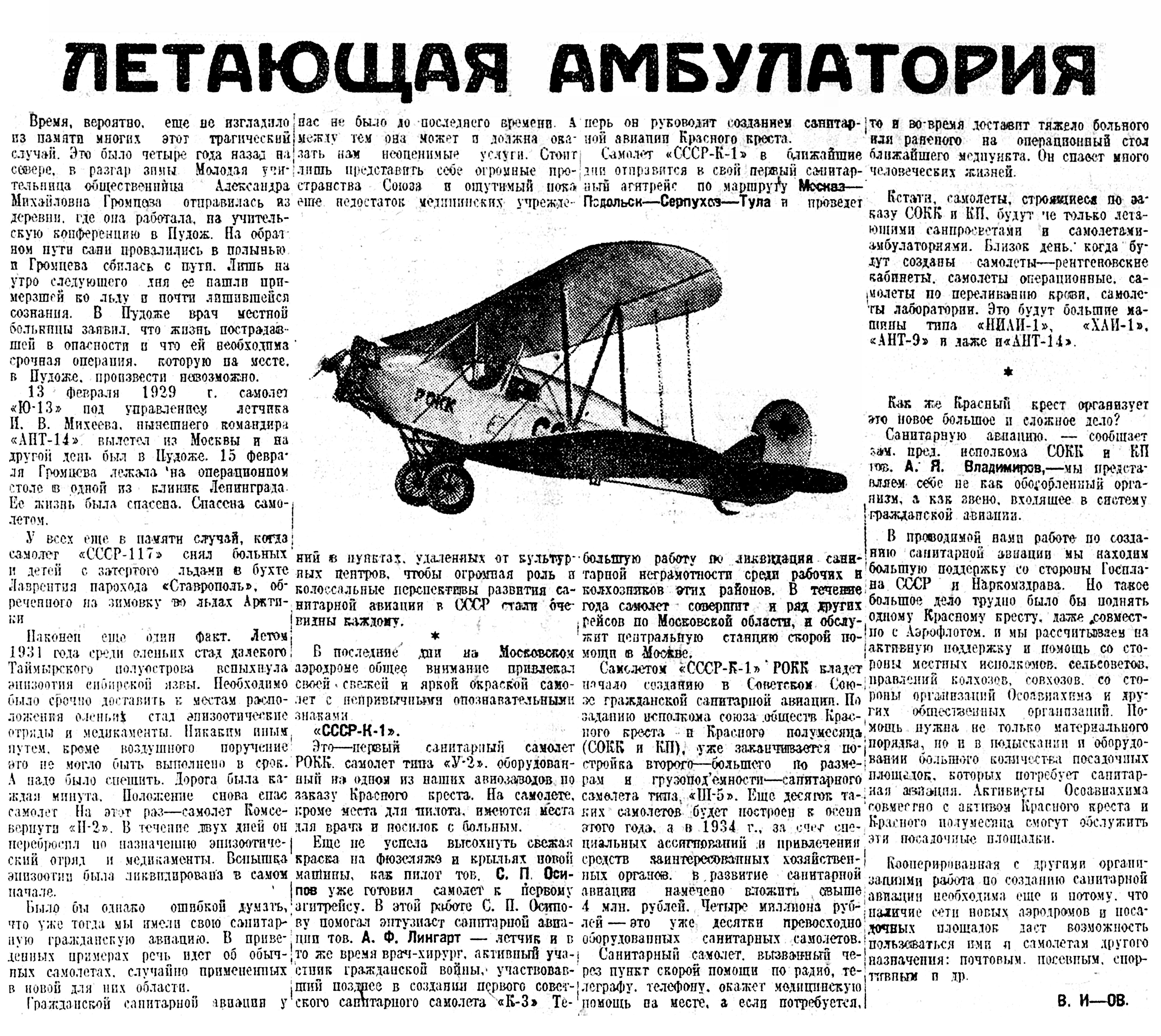 Кстати, самолеты, строящиеся по заказу СОКК и КП, будут не только летающими санпросветами и самолетами-амбулаториями. Близок день, когда будут созданы самолеты — рентгеновские кабинеты, самолеты операционные, самолеты по переливанию крови, самолеты лаборатории. Это будут большие машины типа "НИАИ-1", "ХАИ-1", "АНТ-9" и даже и "АНТ-14".