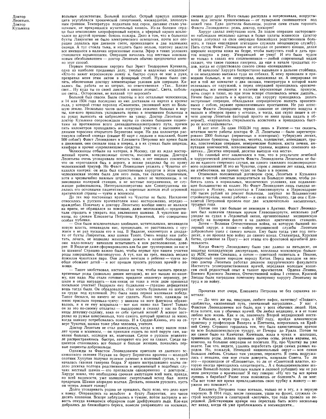 Чуть ли не ежедневно персонал больницы устраивал «субботники». мыл, драил, шпаклевал, красил, замазывал. А врачебного-то персонала было всего двое: молоденькая Зинаида Николаевна Котова и заведующая больницей Елизавета Петровна Кузьмина, уже бывалый северный врач, имевший опыт дальних кочевий с ненцами в Большеземельской тундре, с коряками — по безлюдным берегам Камчатки. Впервые приехав из Уэлена в больницу бухты Лаврентия, доктор Леонтьев (он привез на срочную операцию девочку-подростка) познакомился с Елизаветой Петровной Кузьминой. Они полюбили друг друга и вскоре стали мужем и женой.