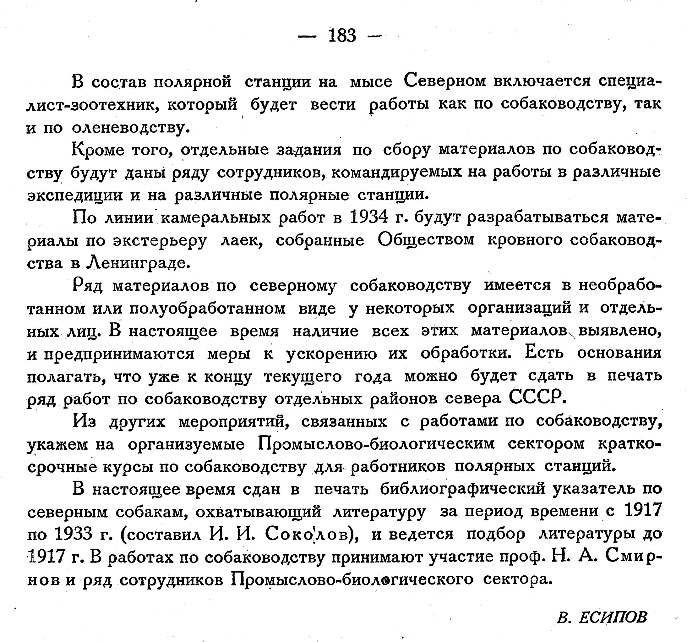 В настоящее время сдан в печать библиографический указатель по северным собакам, охватывающий литературу за период времени с 1917 по 1933 г. (составил И. И. Соколов), и ведется подбор литературы до 1917 г. В работах по собаководству принимают участие проф. Н. А. Смирнов и ряд сотрудников Промыслово-биологического сектора.