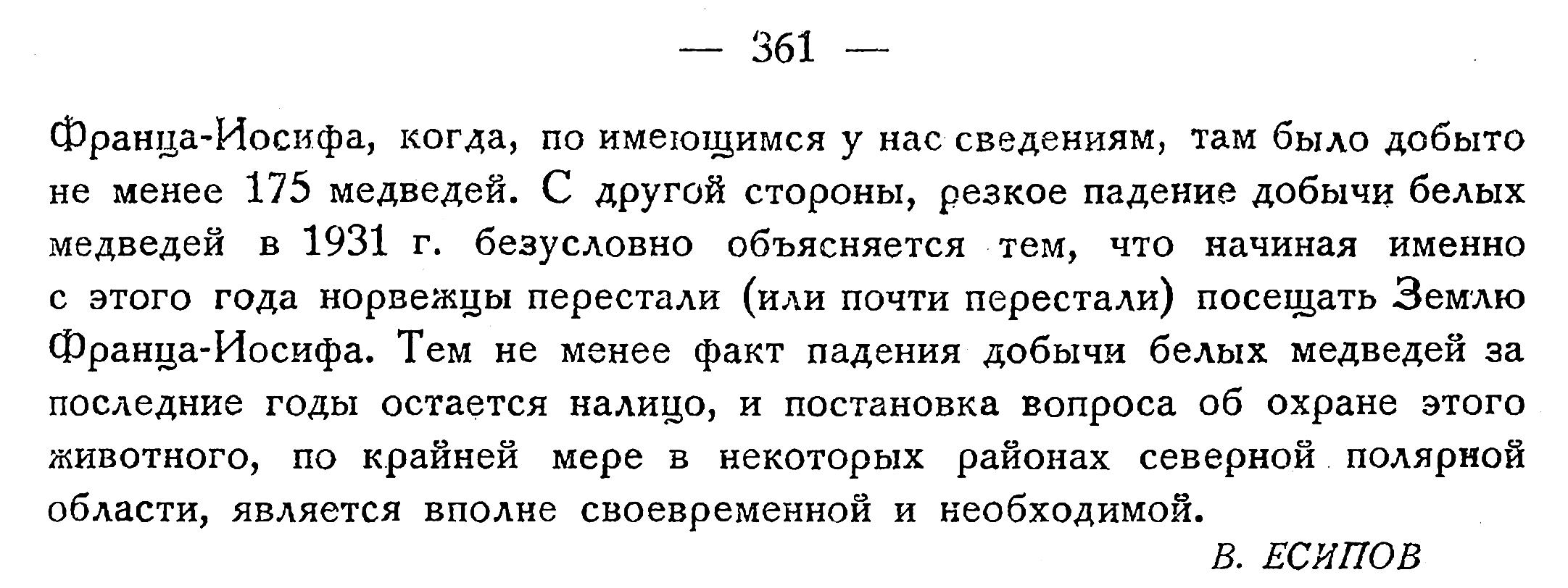 Проф. Л. Брюль (L. ВrűhI) в своей статье о современном состоянии вопроса охраны природы в Скандинавских странах, напечатанной в немецком журнале „Naturschutz” (1933, № 10), приводит интересные данные о количестве добытых норвежцами белых медведей (живых и мертвых) в период времени с 1924 по 1931 г. на Шпицбергене и в Гренландии. В среднем за указанное время норвежскими зверобоями ежегодно добывалось до 375 медведей. Если же рассмотреть добычу по отдельным годам, то ясно будет видно, что количество добываемых медведей с небольшими колебаниями уменьшается год от года. По отдельным годам добыча норвежцев распределяется следующим образом: в 1924 г.—733, в 1925 г.—570, в 1926 г.—134, в 1927 г.—300, в 1928 г.—481, в 1929 г.—388, в 1930 г.—306, в 1931 г.—88. Надо полагать, что в приведенные автором цифры добычи медведей входят также и медведи, добытые норвежцами в архипелаге Франца-Иосифа. Так, например, значительное повышение добычи в 1928 г., по сравнению с предыдущими годами, повидимому объясняется тем, что этот год явился особенно добычливым на Земле Франца-Иосифа, когда, по имеющимся у нас сведениям, там было добыто не менее 175 медведей. С другой стороны, резкое падение добычи белых медведей в 1931 г. безусловно объясняется тем, что начиная именно с этого года норвежцы перестали (или почти перестали) посещать Землю Франца-Иосифа. Тем не менее факт падения добычи белых медведей за последние годы остается налицо, и постановка вопроса об охране этого животного, по крайней мере в некоторых районах северной полярной области, является вполне своевременной и необходимой.