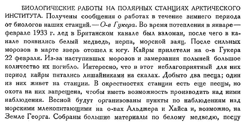 Получены сообщения о работах в течение зимнего периода от биологов наших станций. — О-в Гукера. Во время потепления в январе — феврале 1933 г. лед в Британском канале был взломан, после чего в канале появились белый медведь, нерпа, морской заяц. После сильных морозов в марте зверь отошел к югу. Кайры прилетели на о-в Гукера 22 февраля. Из-за наступивших морозов и замерзания полыней большое количество их погибло. Интересно, что в этот неблагоприятный для них период кайры питались лишайниками на скалах. Добыто два песца; один из них живет на станции. В окрестностях станции есть еще песцы, но охота на них запрещена, чтобы иметь возможность производить над ними наблюдения. Весной будут организованы пункты по наблюдениям над морскими млекопитающими на о-вах Альджера и Хейса и, возможно, на Земле Георга. Собраны большие материалы по белому медведю, песцу и птицам. — Мыс Челюскин. Биолог станции Г. Л. Рутилевский в половине апреля 1933 г. вернулся из маршрута в пролив Шокальского. В проливе сделаны наблюдения над морскими млекопитающими и произведен количественный их учет. В феврале в районе станции наблюдались в большом количестве белые медведи, в полыньях держались моржи. Замечены волки. У о-ва Самуила наблюдались следы дикого оленя. Г. Л. Рутилевский собирается в конце апреля выйти в бухту Фаддея. — Северная Земля. По сообщению Н. П. Демме, морских млекопитающих в районе станции, помимо белух, нет совершенно. Небольшое количество песцов держится с осени 1932 г. у остатков туш морского зверя, добытого зимовкой Г. А. Ушакова на о-ве Голомянном.