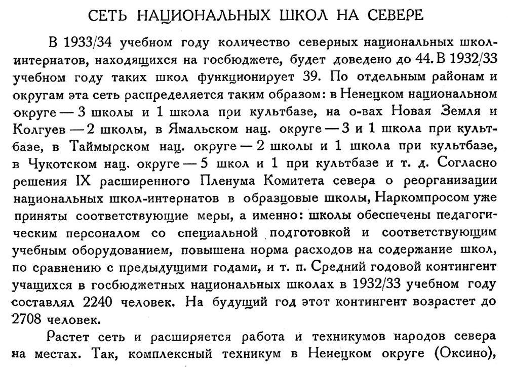 В 1933/34 учебном году количество северных национальных школ-интернатов, находящихся на госбюджете, будет доведено до 44. В 1932/33 учебном году таких школ функционирует 39. По отдельным районам и округам эта сеть распределяется таким образом: в Ненецком национальном округе — 3 школы и 1 школа при культбазе, на о-вах Новая Земля и Колгуев — 2 школы, в Ямальском нац. округе — 3 и 1 школа при культбазе, в Таймырском нац. округе — 2 школы и 1 школа при культбазе, в Чукотском нац. округе — 5 школ и 1 при культбазе и т. д. Согласно решения IX расширенного Пленума Комитета севера о реорганизации национальных школ-интернатов в образцовые школы, Наркомпросом уже приняты соответствующие меры, а именно: школы обеспечены педагогическим персоналом со специальной подготовкой и соответствующим учебным оборудованием, повышена норма расходов на содержание школ, по сравнению с предыдущими годами, и т. п. Средний годовой контингент учащихся в госбюджетных национальных школах в 1932/33 учебном году составлял 2240 человек. На будущий год этот контингент возрастет до 2708 человек.