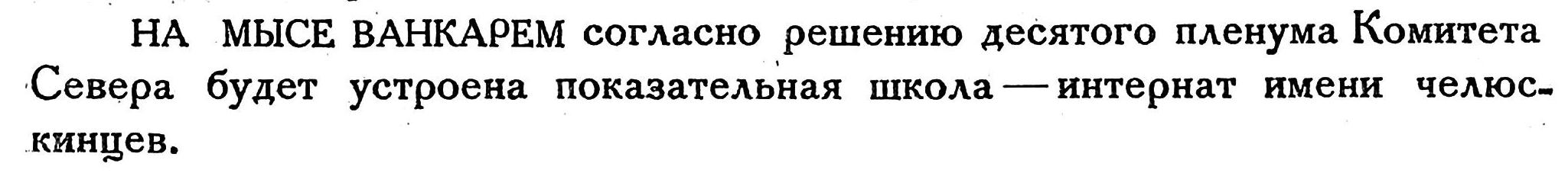 НА МЫСЕ ВАНКАРЕМ согласно решению десятого пленума Комитета Севера будет устроена показательная школа — интернат имени челюскинцев.