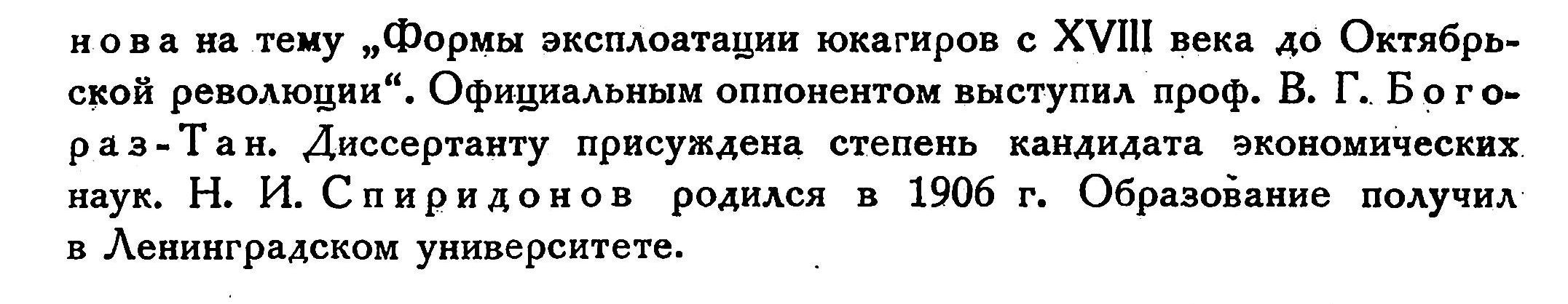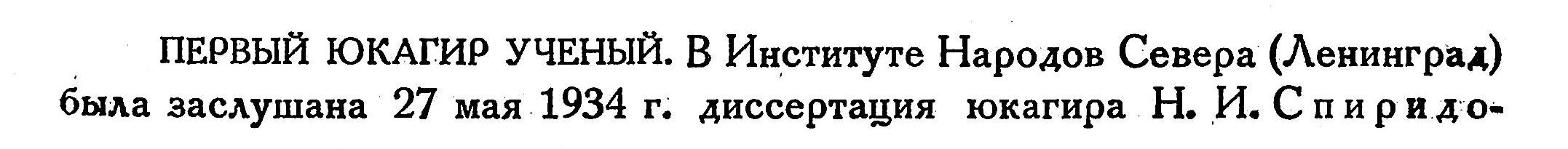 ПЕРВЫЙ ЮКАГИР УЧЕНЫЙ. В Институте Народов Севера (Ленинград) была заслушана 27 мая 1934 г. диссертация юкагира Н. И. Спиридонова на тему „Формы эксплоатации юкагиров с XVIII века до Октябрьской революции". Официальным оппонентом выступил проф. В. Г. Богораз-Тан. Диссертанту присуждена степень кандидата экономических наук. Н. И. Спиридонов родился в 1906 г. Образование получил в Ленинградском университете.