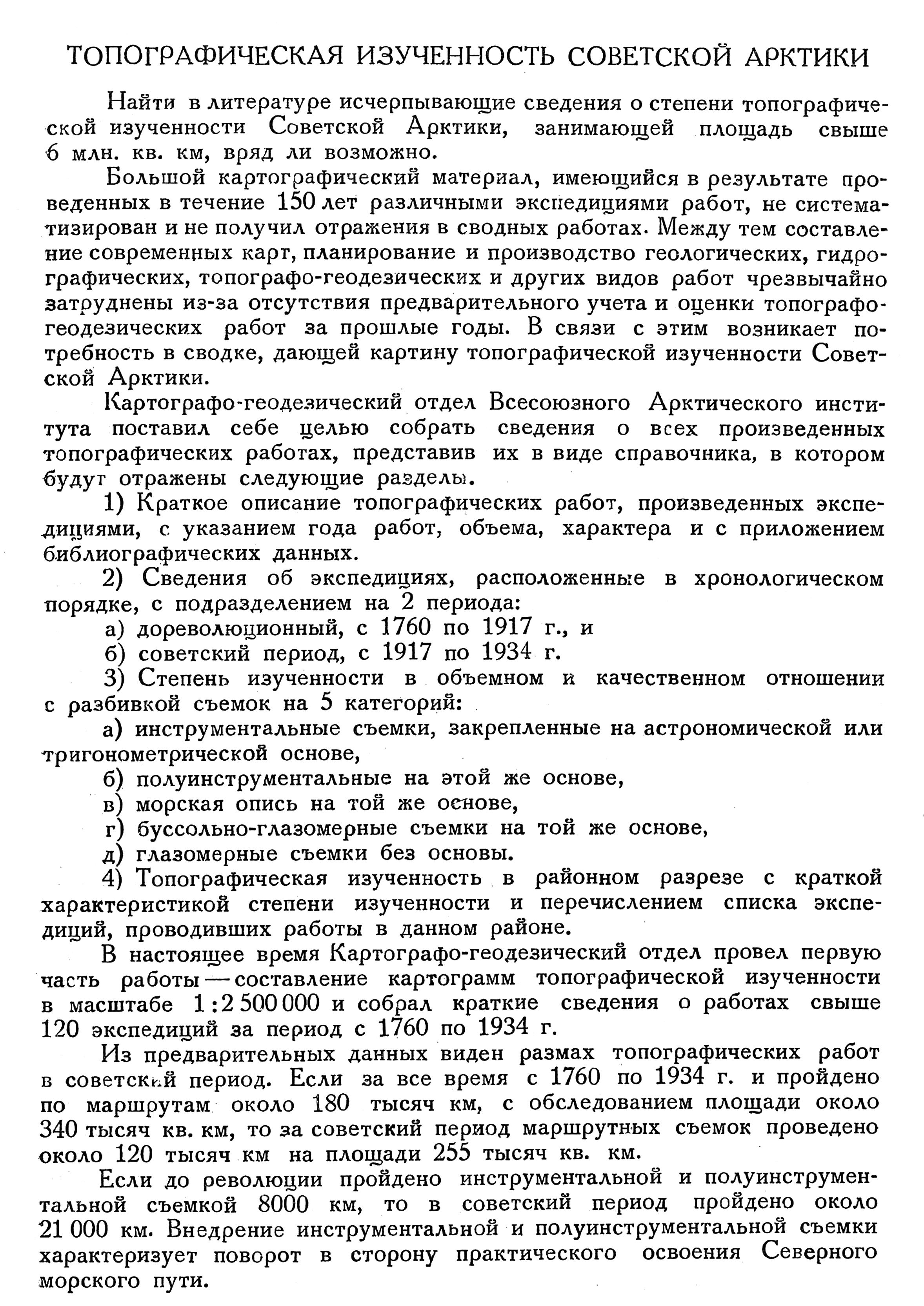 1) создание для Советского сектора Арктики надежной обзорной карты сравнительно крупного масштаба (1: 500 000—1 000 000), обеспечивающей общие запросы народного хозяйства и научно-исследовательского дела, и 2) создание ряда крупномасштабных карт для отдельных районов, имеющих актуальное народнохозяйственное значение. 1933—1934 гг.{1} прошли под знаком выполнения этих заданий.