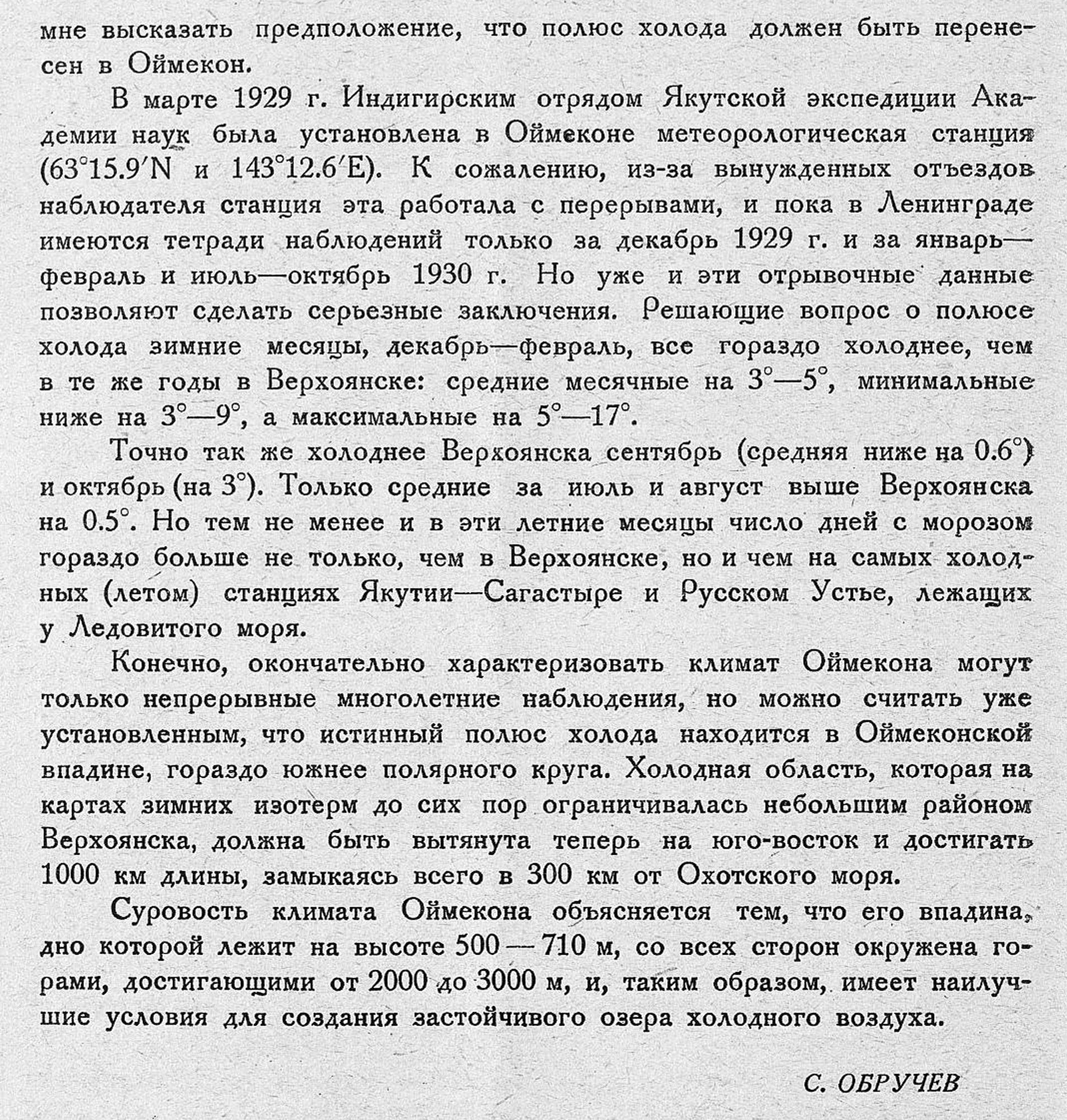 В 1926 г., во время работ Индигирской экспедиции Геологического комитета, было обнаружено, что температуры октября и ноября в Оймеконе (впадина, лежащая в верховьях Индигирки между 63° и 64°N) на 3°—7° ниже чем в Верхоянске, признанном полюсе холода. Это позволило мне высказать предположение, что полюс холода должен быть перенесен в Оймекон.