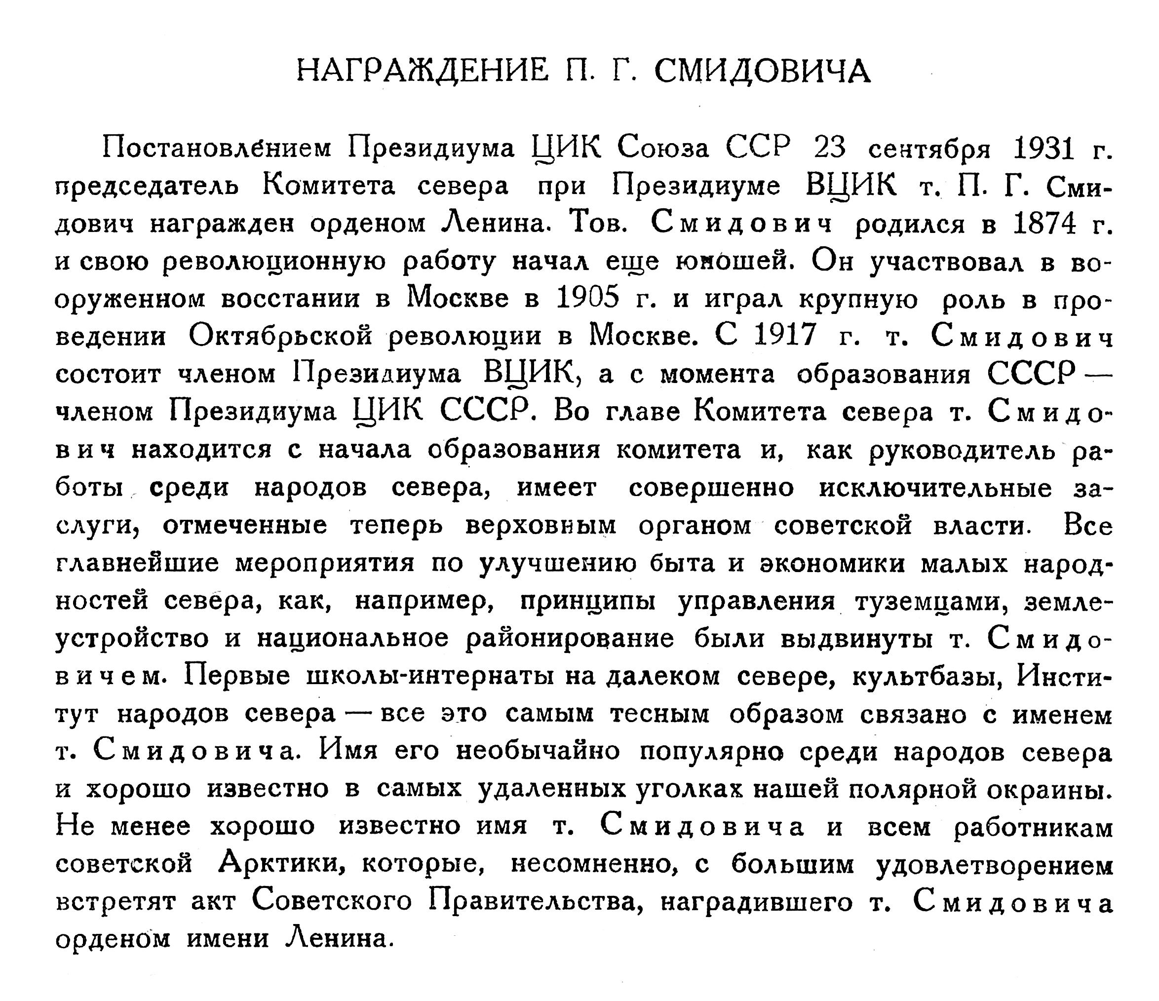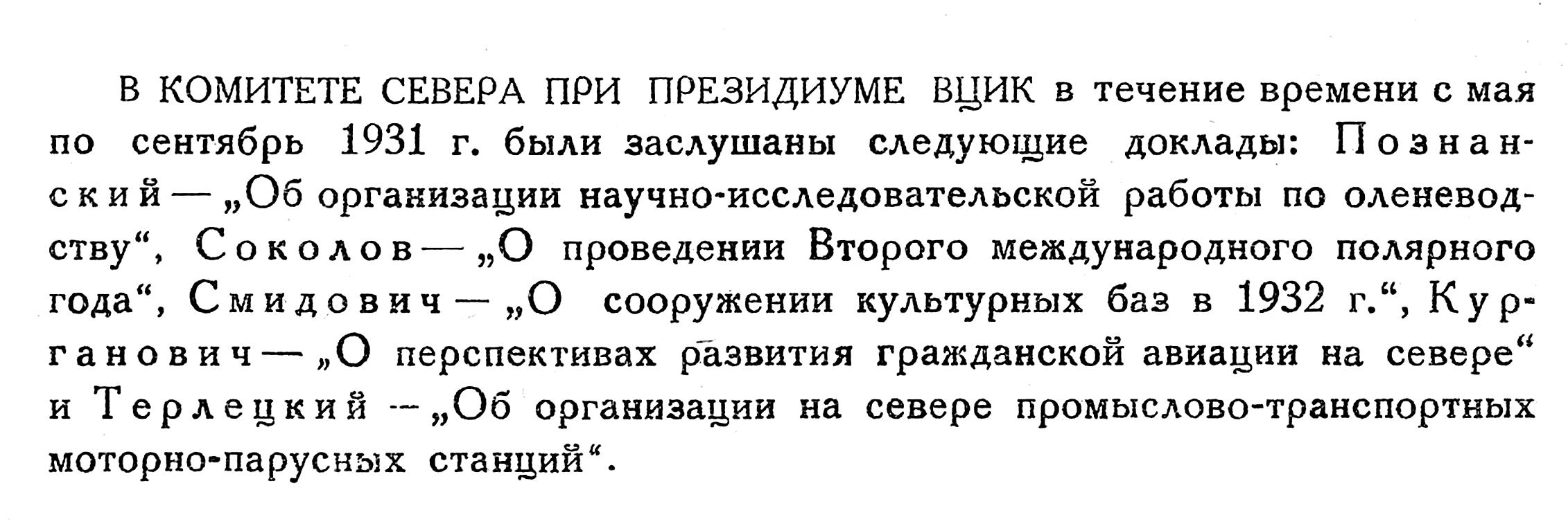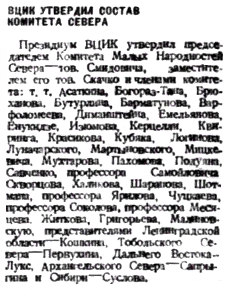 На состоявшемся 20 июля под председательством М. И. Калинина очередном заседании Президиум ВЦИК заслушал доклад тов. Скачко о работе Комитета Севера и принял постановление ликвидировать этот комитет, передав его функции Главному управлению Северного морского пути. Наблюдение за правильным осуществлением национальной политики среди народов Севера возложено на Отдел национальностей при Президиуме ВЦИК. Журнал „Советский Север" решено объединить с журналом „Советская Арктика".