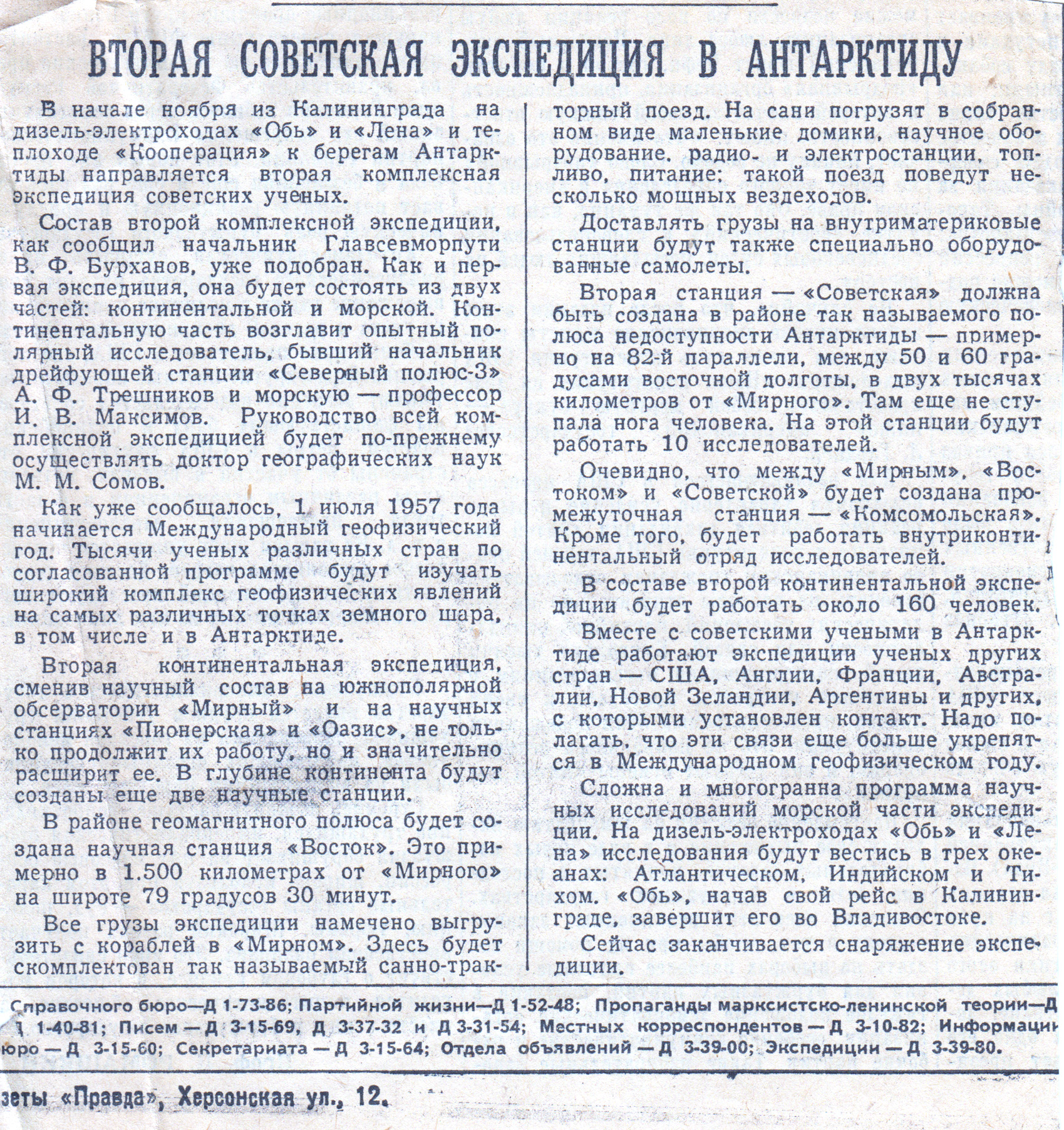 Как уже сообщалось, 1 июля 1957 года начинается Международный геофизический год. Тысячи ученых различных стран по согласованной программе будут изучать широкий комплекс геофизических явлений на самых различных точках земного шара, в том числе и в Антарктиде.