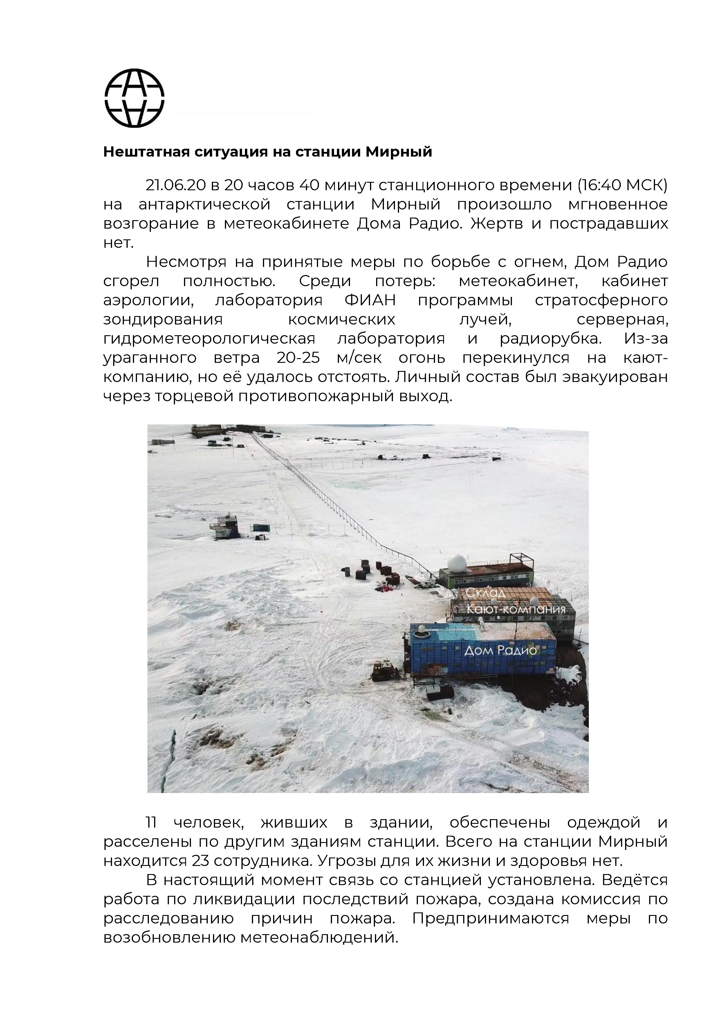21.06.20 в 20 часов 40 минут станционного времени (16:40 МСК) на антарктической станции Мирный произошло мгновенное возгорание в метеокабинете Дома Радио. Жертв и пострадавших нет.