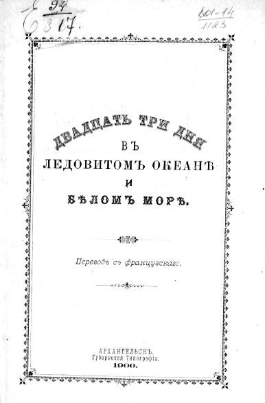 Милевский Игнац Карол.Двадцать три дня в Ледовитом океане и Белом море / Пер. с фр. [В. Чебыкин]. - Архангельск : Губ. тип., 1900. - [4], 40 с.; 26.