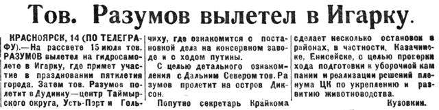 КРАСНОЯРСК, 14 (ПО ТЕЛЕГРАФУ). — На рассвете 15 июля тов. РАЗУМОВ вылетел на гидросамолете в Игарку, где примет участие в праздновании пятилетия города. Затем тов. Раэумов полетит в Дудинку — центр Таймырского округа, Усть-Порт и Гольчиху, где ознакомится с постановкой дела на консервном заводе и с ходом путины.