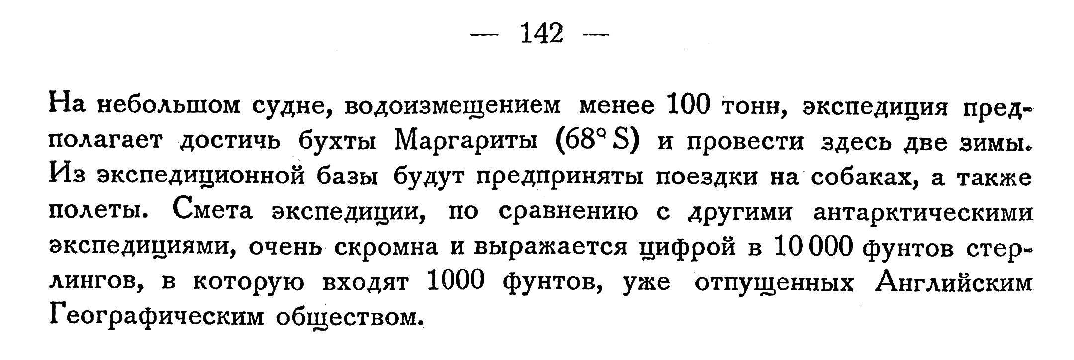 На небольшом судне, водоизмещением менее 100 тонн, экспедиция предполагает достичь бухты Маргариты (68˚ S) и провести здесь две зимы. Из экспедиционной базы будут предприняты поездки на собаках, а также полеты. Смета экспедиции, по сравнению с другими антарктическими экспедициями, очень скромна и выражается цифрой в 10 000 фунтов стерлингов, в которую входят 1000 фунтов, уже отпущенных Английским Географическим обществом.