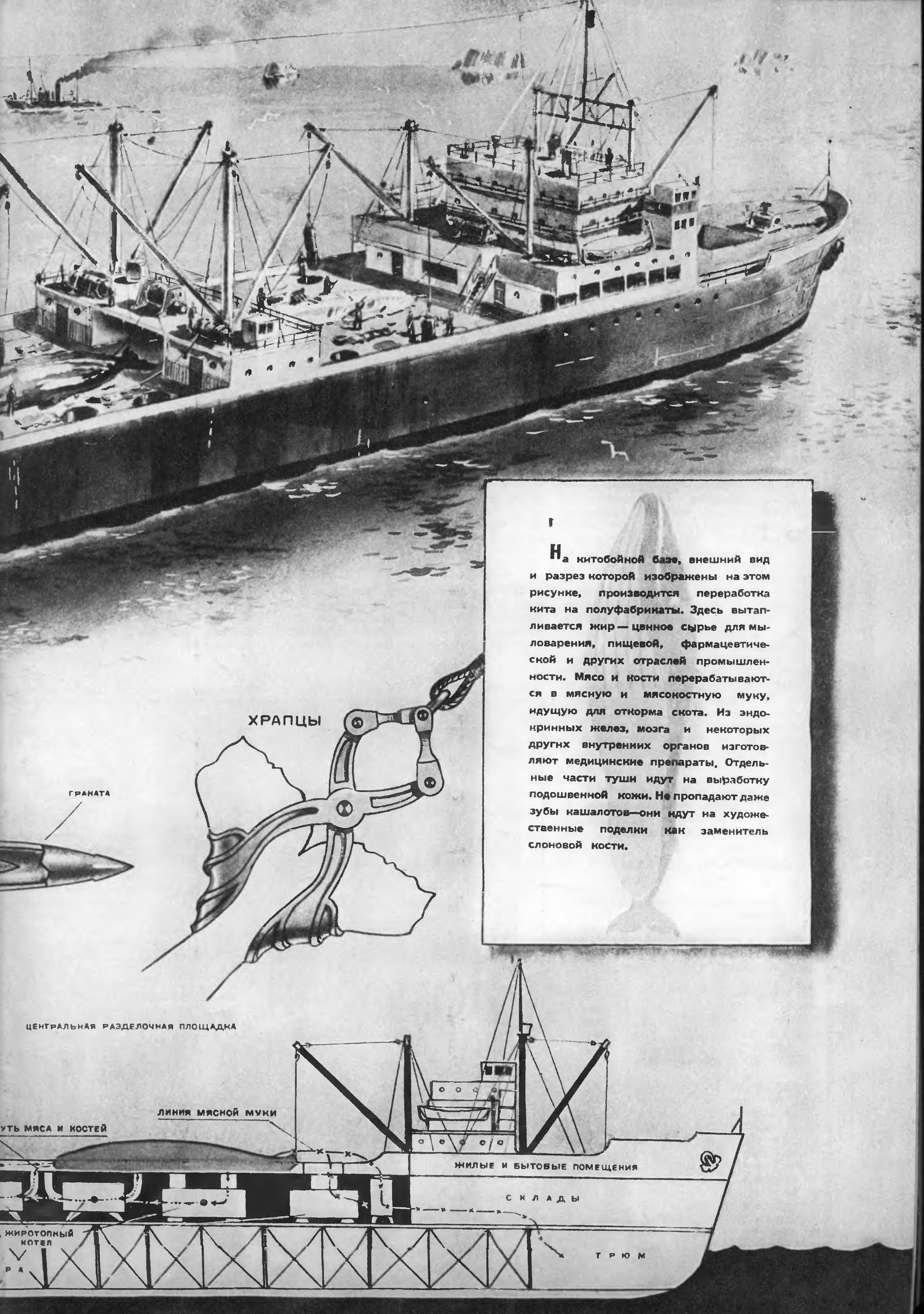 И так «Слава» имеет на носу пост управления, с капитанского мостика можно глазом, вооруженным биноклем, обозревать большой район моря. Техническое название «Слава» имеет на первый взгляд странное— матка. Но она действительно в лаконичной форме характеризует ее назначение. На «Славе» хранятся основные запасы флотилии, на ней расположен большой пловучий завод по обработке китовых туш, состоящий из нескольких цехов: растопки китового жира, выпуска консервов, помола муки из китовой кости и т. д. Несмотря на то, что весь процесс работы завода механизирован, в нем участвуют 250 рабочих. Это говорит о размерах завода.