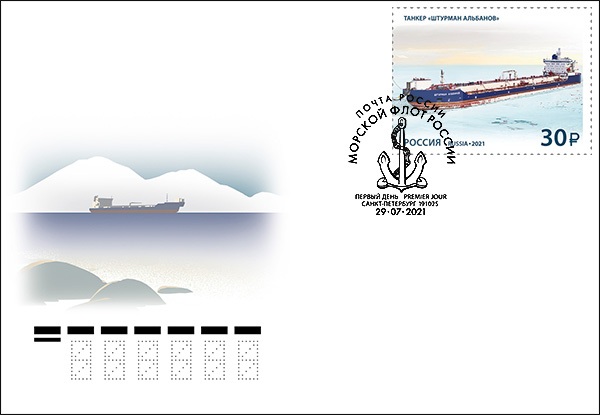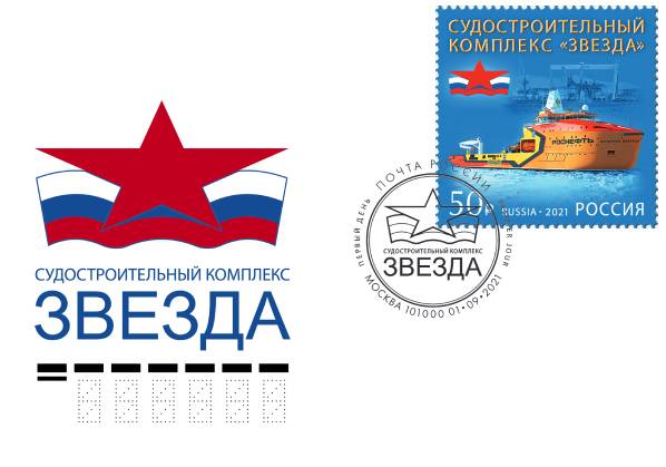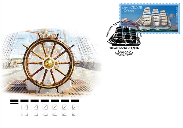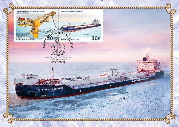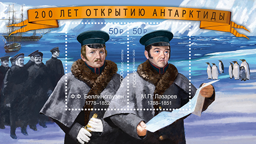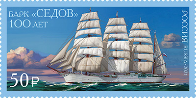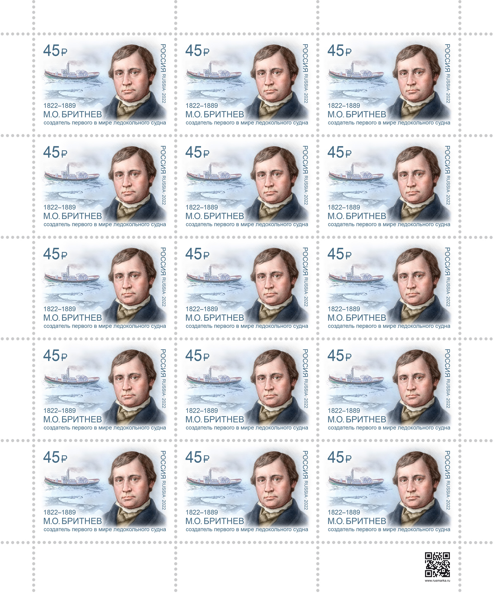 На марке изображены портрет М.О. Бритнева и ледокольное судно «Пайлот».