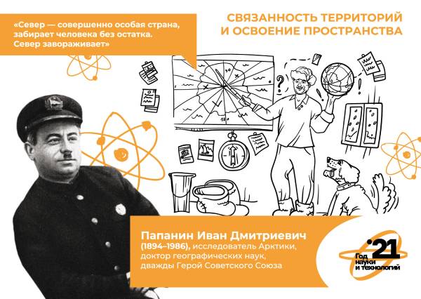 Иван Дмитриевич Папанин (1894−1986) — исследователь Арктики, доктор географических наук, контр-адмирал, дважды Герой Советского Союза. В 1932−1933 гг. — начальник полярной станции в бухте Тихой на Земле Франца-Иосифа, в 1934−1935 гг. — начальник полярной станции на мысе Челюскина. В 1937−1938 гг. возглавил первую советскую экспедицию на Северный полюс, проходившую на дрейфующих льдах Северного Ледовитого океана.