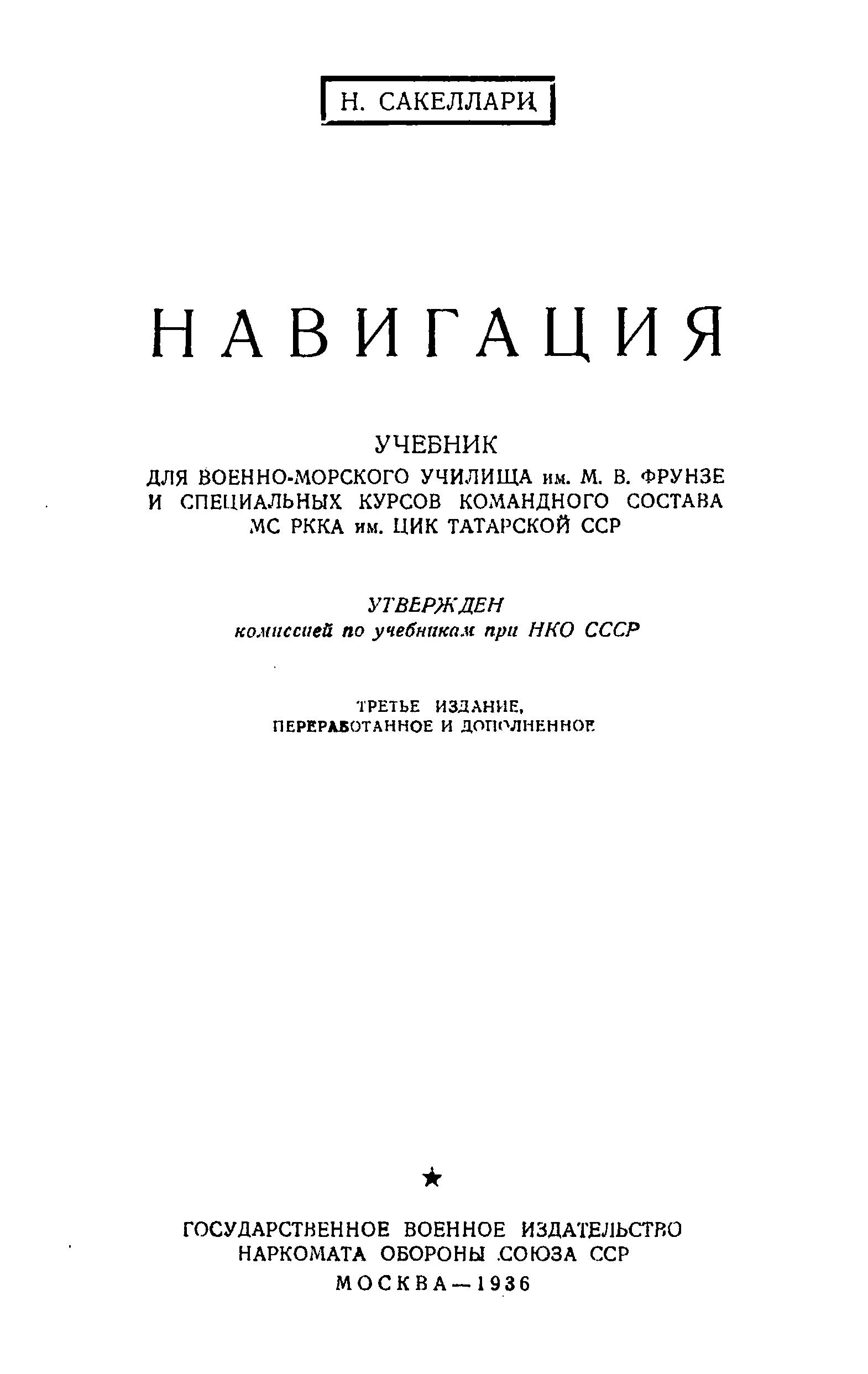 11 марта 1936 г. в период подготовки настоящего труда к печати скончался его автор, профессор Военно-морской академии им. тов. Ворошилова, флагман 2 ранга Николай Александрович Сакеллари, выдающийся научный работник в области кораблевождения, автор ряда научных трудов и учебных руководств и исключительный педагог, воспитавший и подготовивший многочисленные кадры советских штурманов и гидрографов.