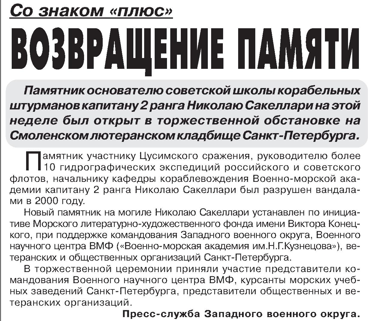 Памятник основателю советской школы корабельных штурманов капитану 2 ранга Николаю Сакеллари на этой неделе был открыт в торжественной обстановке на Смоленском лютеранском кладбище Санкт-Петербурга.